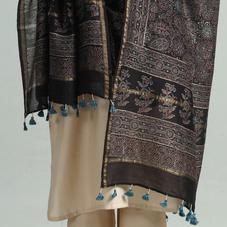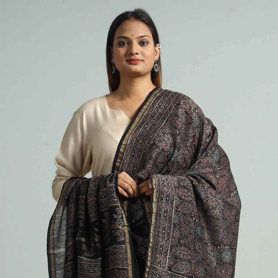This exquisite black ajrakh hand block printed chanderi silk dupatta is crafted with the finest quality chanderi silk fabric, ensuring a comfortable feel against your skin. Meticulously created using natural dyes through traditional ajrakh technique of hand block printing practised by the artisans in Kutch region of Gujarat.
