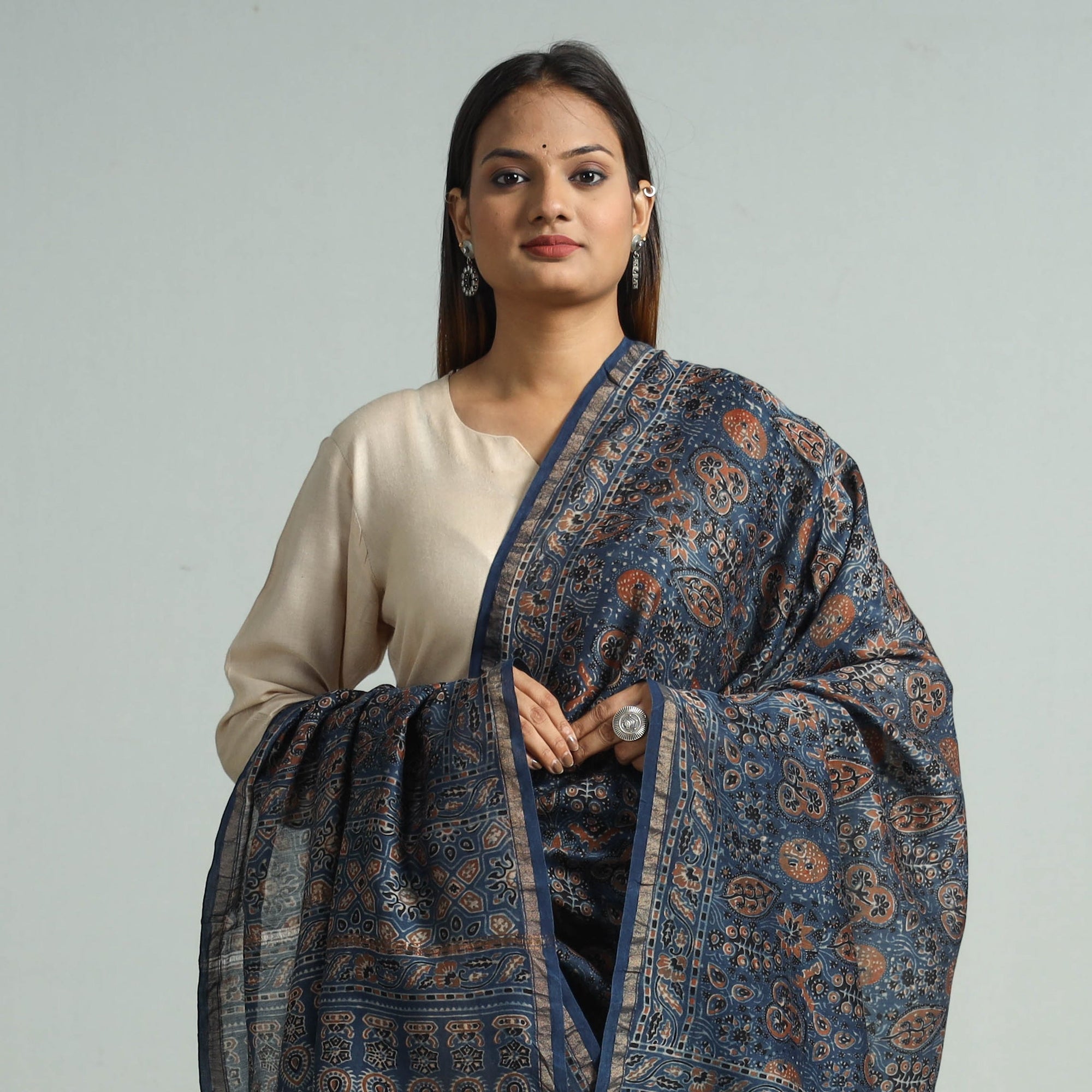 | Material | This exquisite blue ajrakh hand block printed chanderi silk dupatta is crafted with the finest quality chanderi silk fabric, ensuring a comfortable feel against your skin. Meticulously created using natural dyes through traditional ajrakh technique of hand block printing practised by the artisans in Kutch region of Gujarat. |