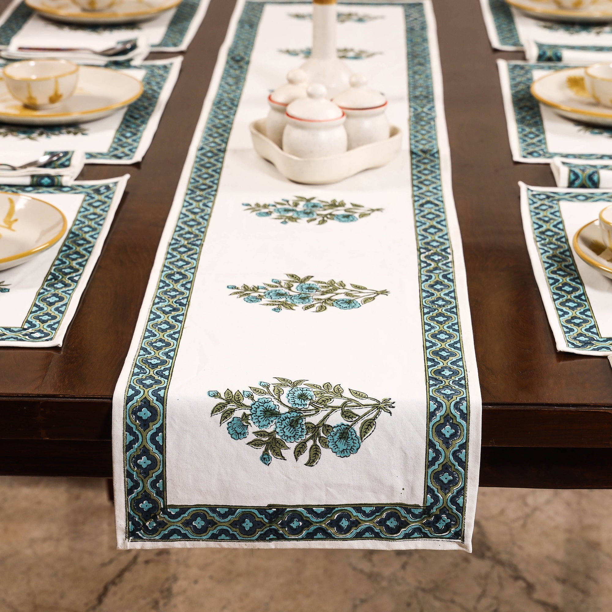 Introducing our exquisite white sanganeri block printed cotton table runner, table mat & napkins set. Crafted using the traditional hand-block printing technique from Sanganer, Jaipur, each piece showcases intricate designs and vibrant colors. Made with bleed-free VAT dyes, these high-quality textiles add elegance and charm to any dining experience.