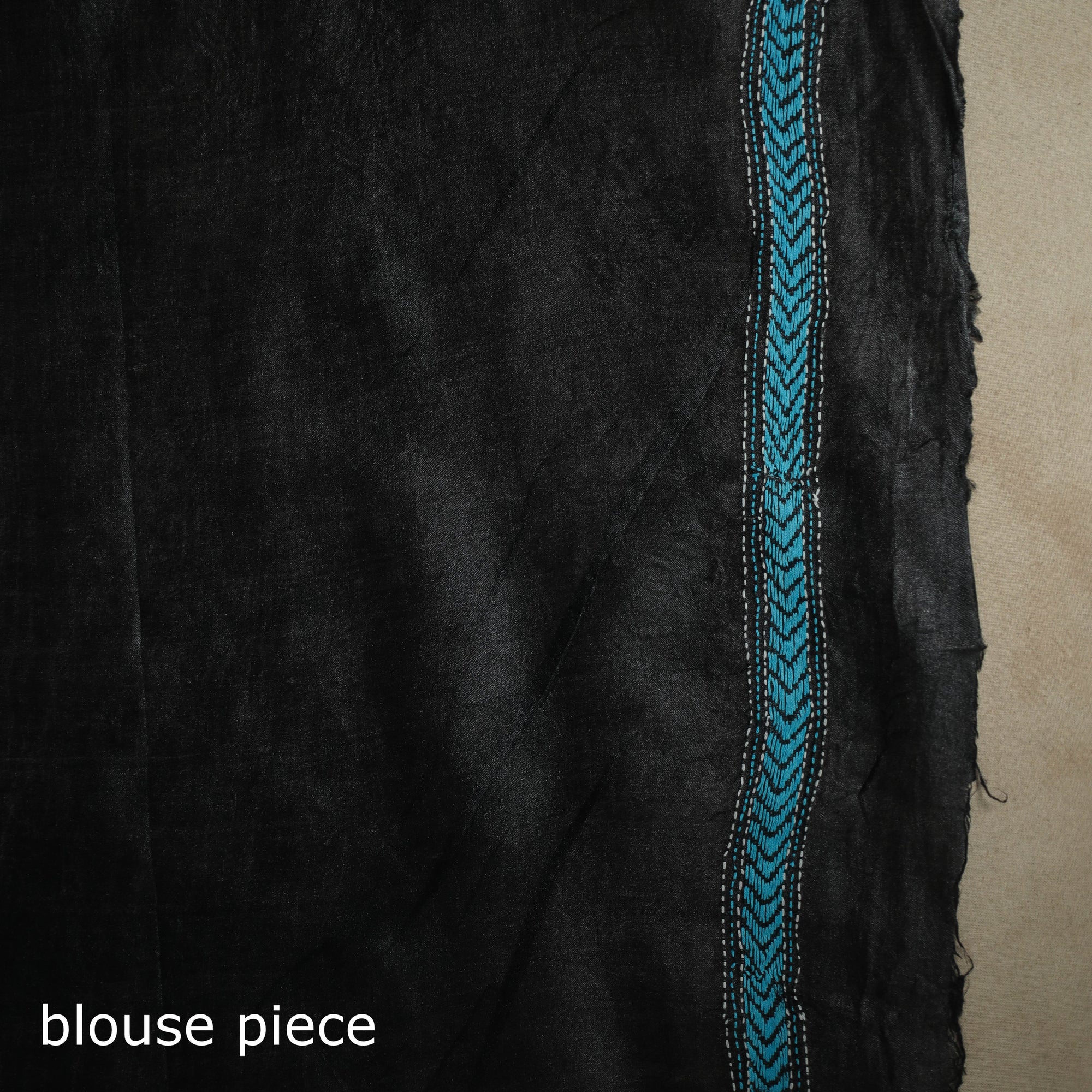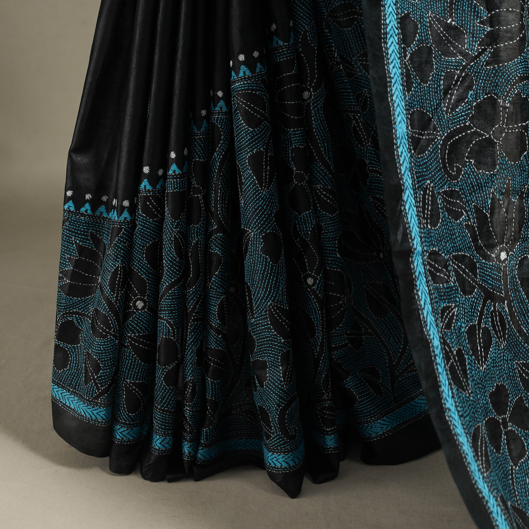 Fine quality black kantha hand embroidery pure tussar silk handloom saree from West Bengal. This exquisite saree is designed with contemporary patterns and has been hand embroidered using West Bengal's traditional craft technique of Kantha. The pure tussar silk offers a delightful drape and breathability, ensuring optimal comfort throughout the day. Its lightweight, soft texture feels gentle against the skin. This saree is a versatile choice, suitable for various occasions – from casual gatherings to formal events.