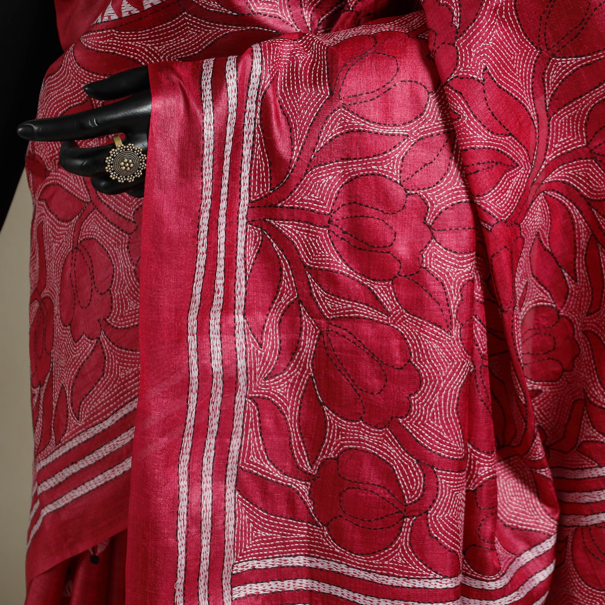 Red - Bengal Hand Embroidery Tussar Silk Handloom Kantha Saree 08