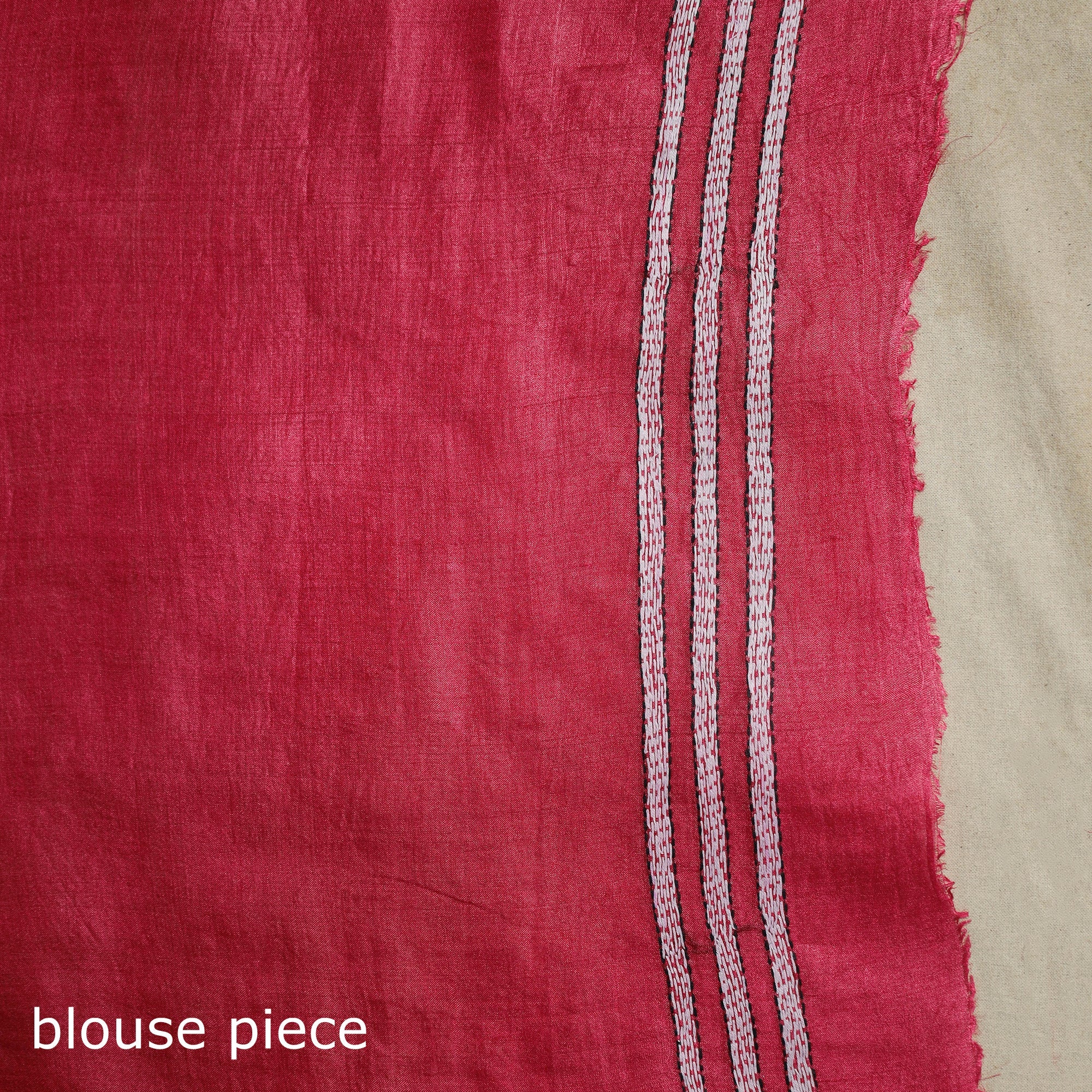 Fine quality red kantha hand embroidery pure tussar silk handloom saree from West Bengal. This exquisite saree is designed with contemporary patterns and has been hand embroidered using West Bengal's traditional craft technique of Kantha. The pure tussar silk offers a delightful drape and breathability, ensuring optimal comfort throughout the day. Its lightweight, soft texture feels gentle against the skin. This saree is a versatile choice, suitable for various occasions – from casual gatherings to formal events.