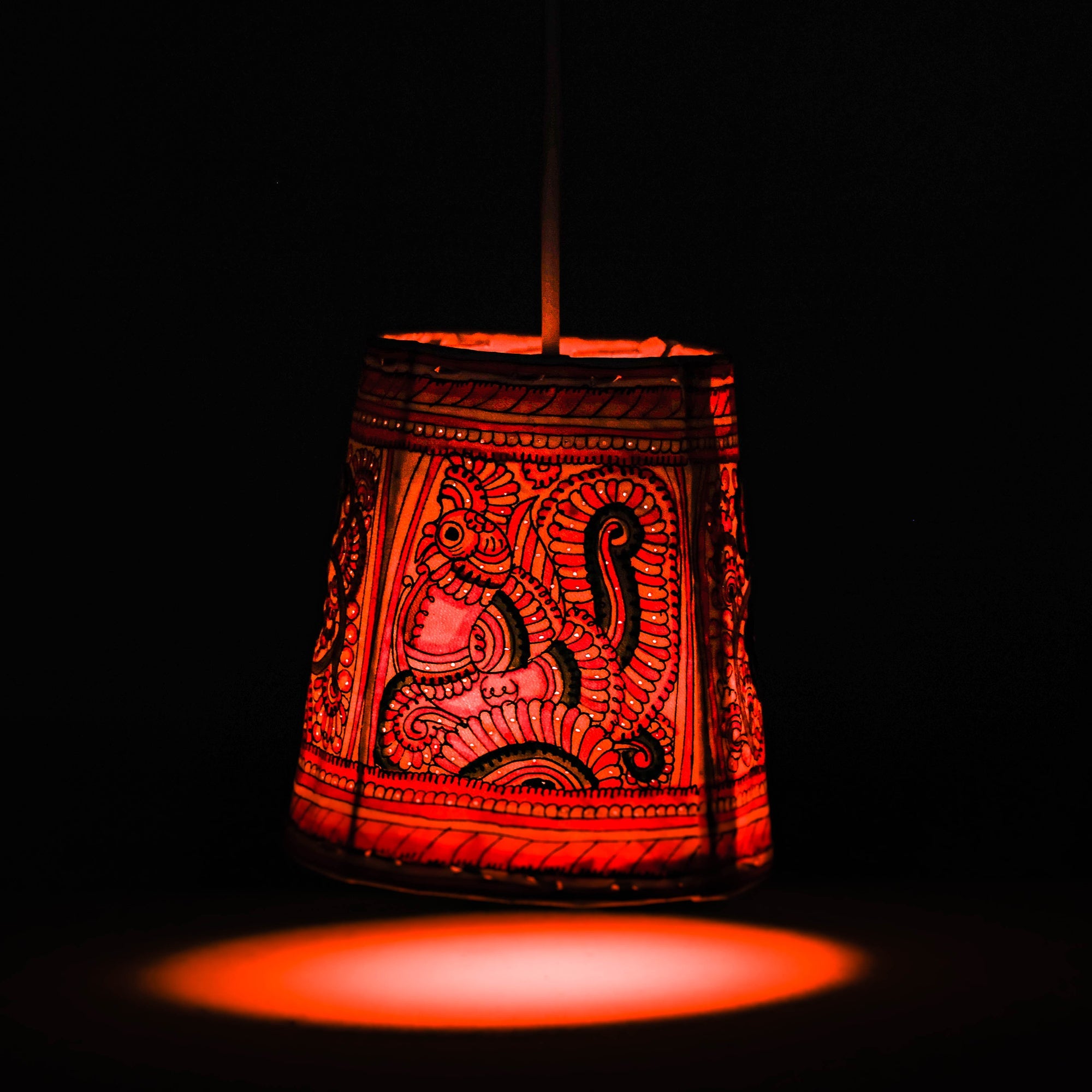| Material | Handpainted tholu bommalata leather hanging lamp from Andhra Pradesh. This leather hanging lamp is a stunning fusion of traditional Indian artistry and modern design. Crafted from genuine leather, this exquisite lamp features intricate tholu bommalata hand-painted motifs. Its warm, ambient lighting creates a cozy atmosphere, making it perfect for enhancing the decor of homes, restaurants, or cultural events. Illuminate your space with a touch of heritage and elegance. Material used - leather, iron frame, natural colors, bulb holder. |