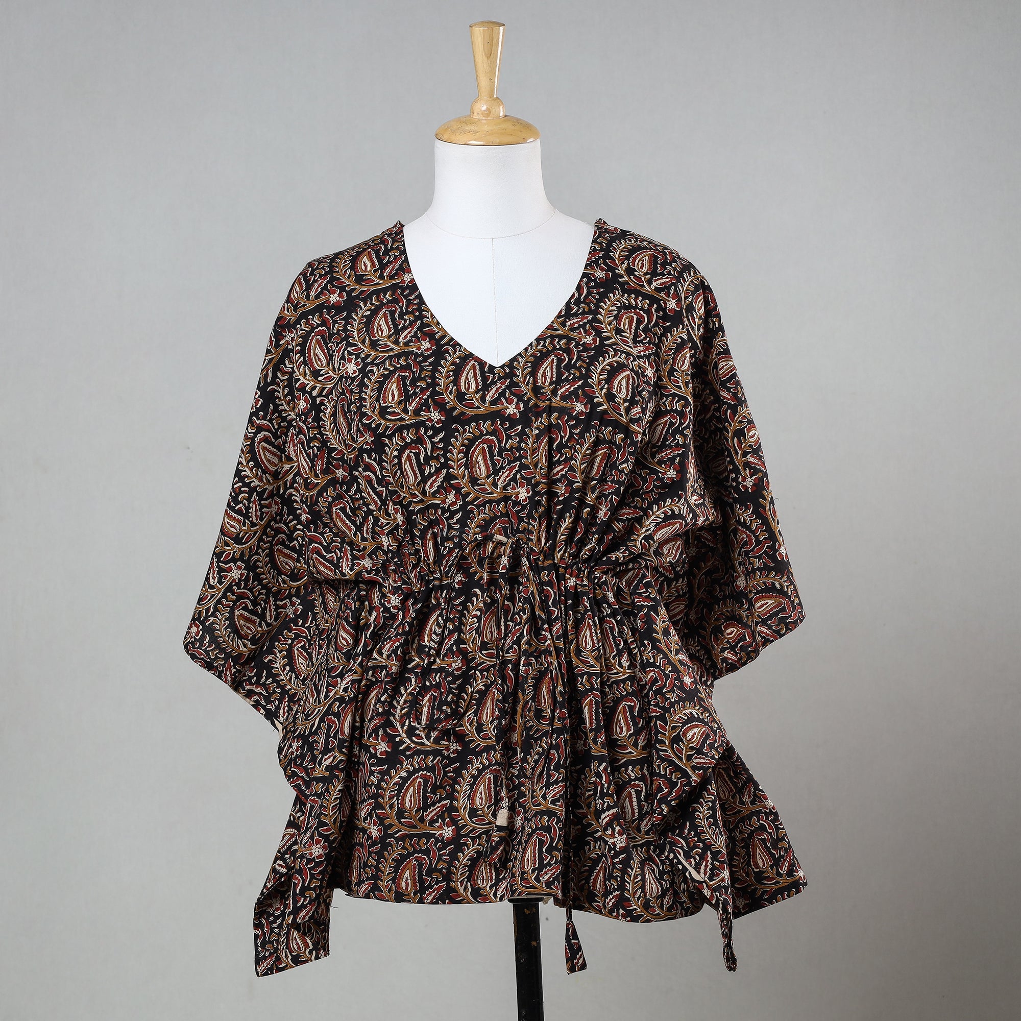 Fine-quality bagru hand block printed cotton short kaftan with tie-up waist. A traditional kaftan, or caftan is a short-length garment with long, flowing sleeves. It has an adjustable drawstring waist. This loose-fitting cotton kaftan is enhanced by a soft touch and beautiful hand-block prints. This dress will allow you to move with ease and comfort. The drawstring waist tie will give you the freedom to customise the fit to suit your unique shape.
