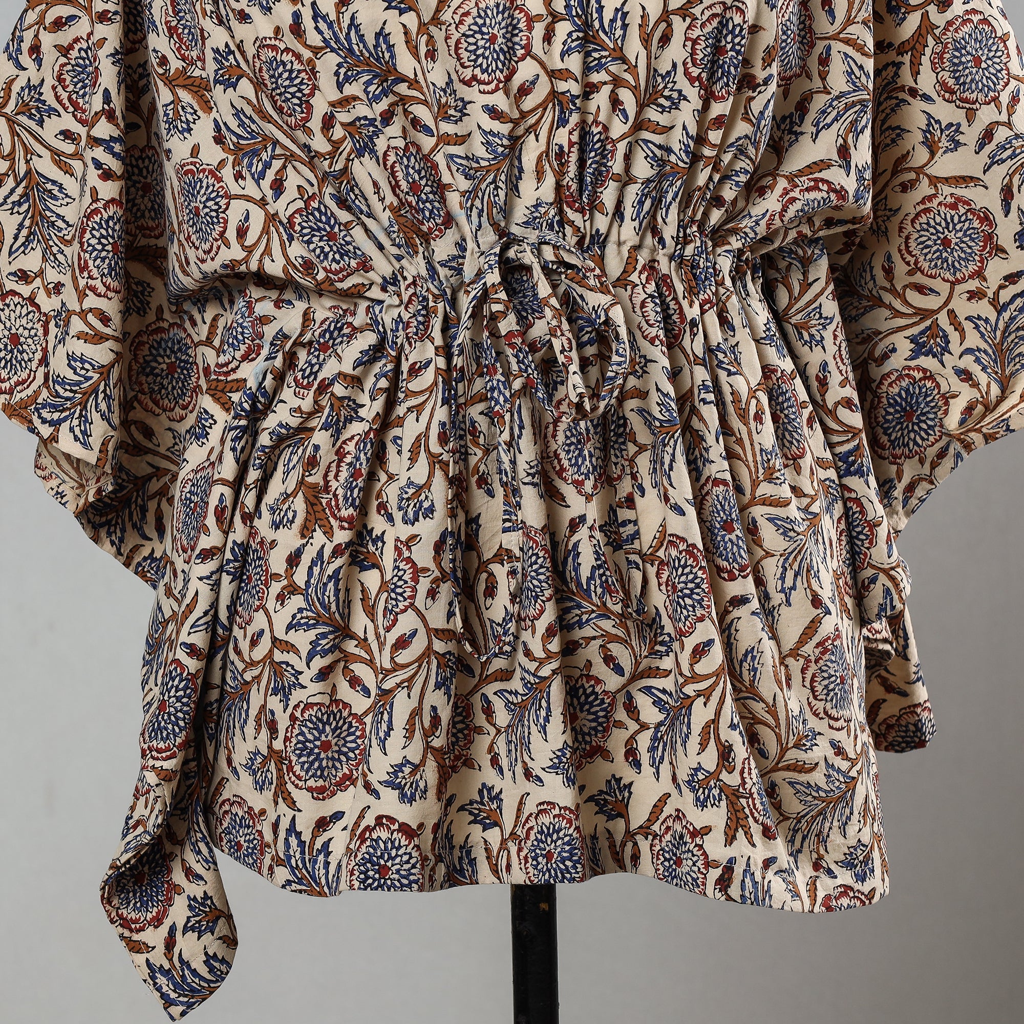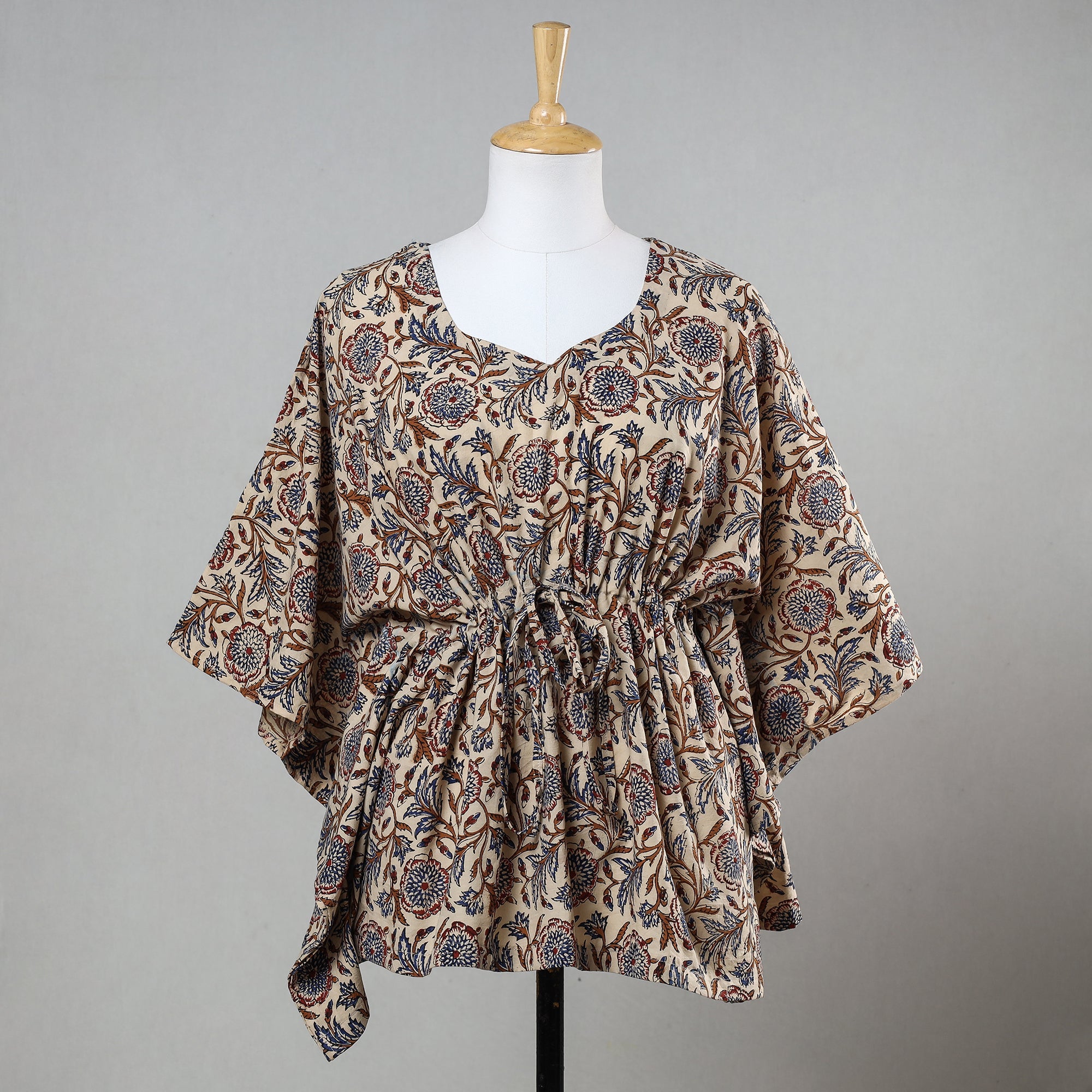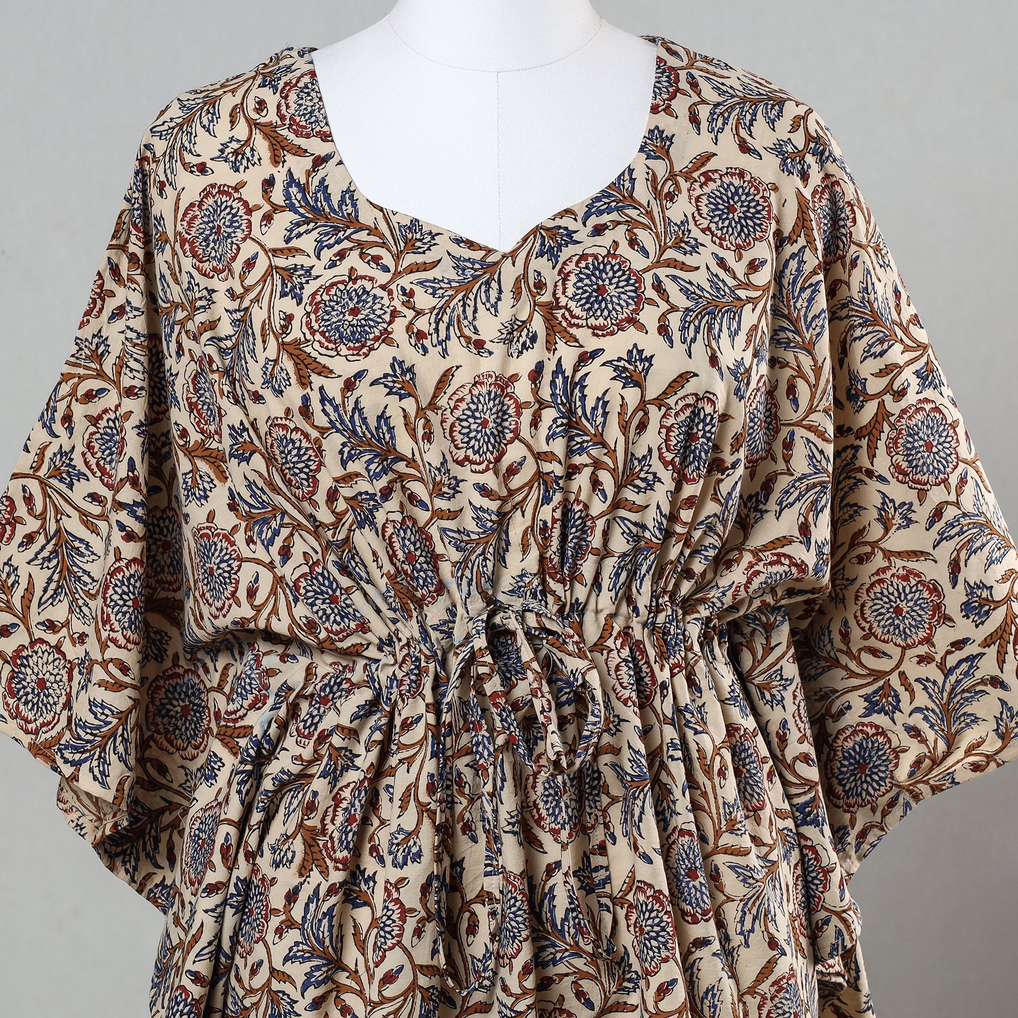 Fine-quality beige bagru hand block printed cotton short kaftan with tie-up waist. A traditional kaftan, or caftan is a short-length garment with long, flowing sleeves. It has an adjustable drawstring waist. This loose-fitting cotton kaftan is enhanced by a soft touch and beautiful hand-block prints. This dress will allow you to move with ease and comfort. The drawstring waist tie will give you the freedom to customise the fit to suit your unique shape.