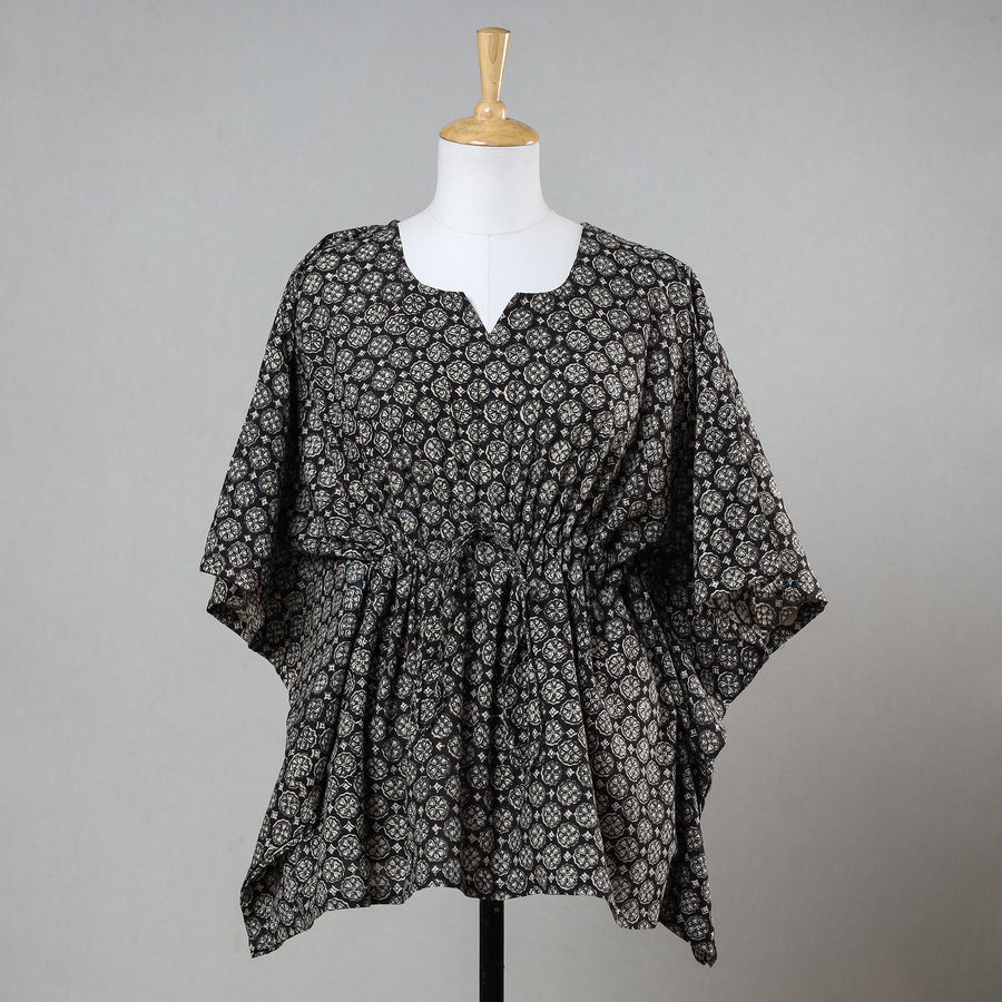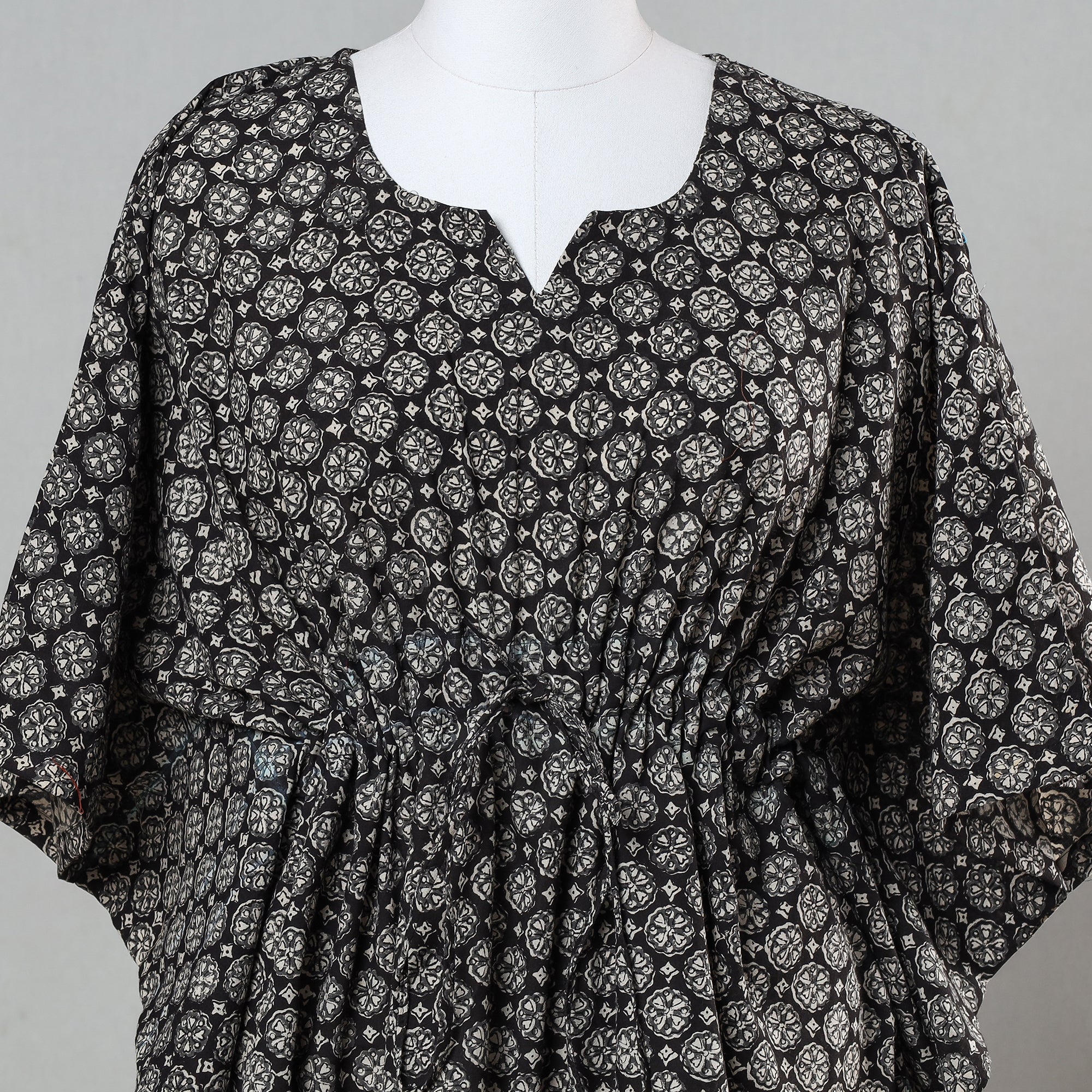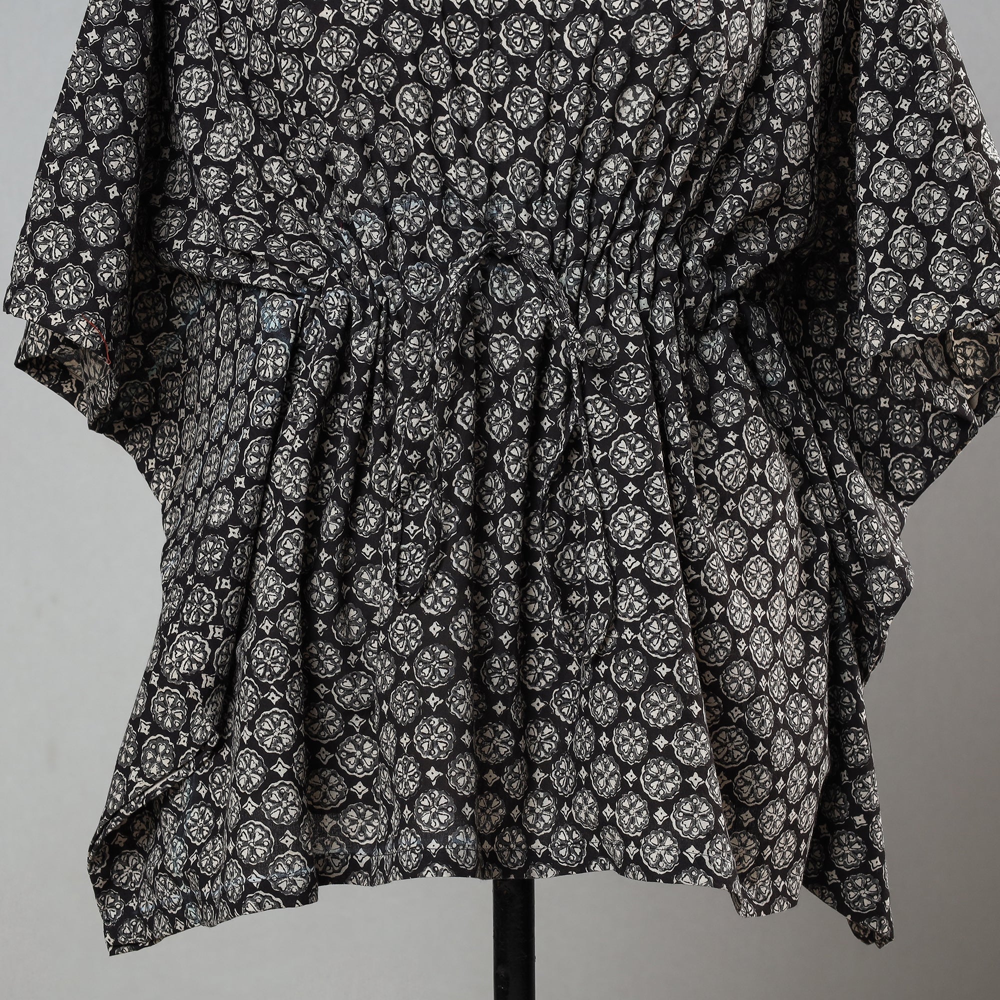 Black - Bagru Block Printed Cotton Kaftan with Tie-Up Waist (Short)
