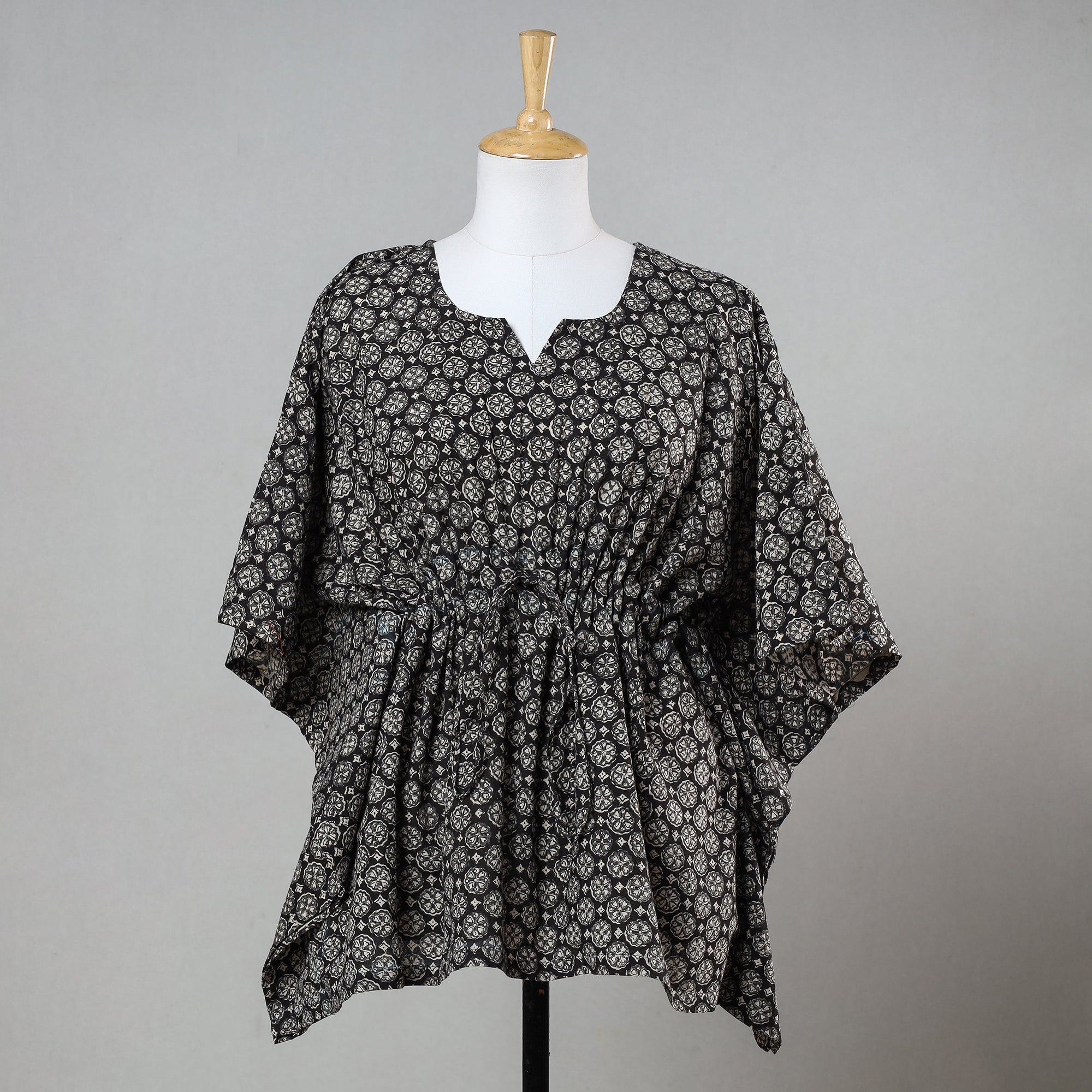Fine-quality bagru hand block printed cotton short kaftan with tie-up waist. A traditional kaftan, or caftan is a short-length garment with long, flowing sleeves. It has an adjustable drawstring waist. This loose-fitting cotton kaftan is enhanced by a soft touch and beautiful hand-block prints. This dress will allow you to move with ease and comfort. The drawstring waist tie will give you the freedom to customise the fit to suit your unique shape.