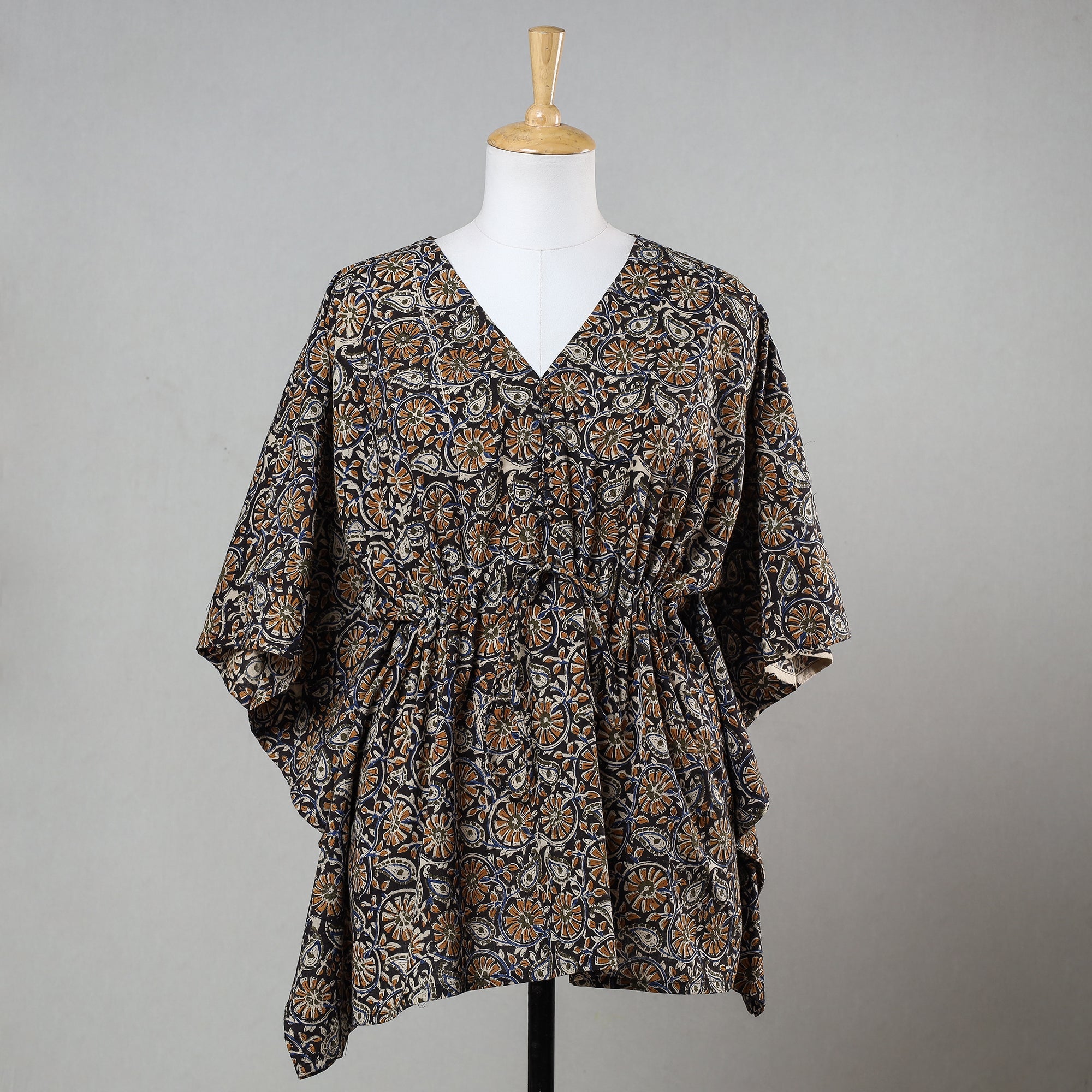 Fine-quality bagru hand block printed cotton short kaftan with tie-up waist. A traditional kaftan, or caftan is a short-length garment with long, flowing sleeves. It has an adjustable drawstring waist. This loose-fitting cotton kaftan is enhanced by a soft touch and beautiful hand-block prints. This dress will allow you to move with ease and comfort. The drawstring waist tie will give you the freedom to customise the fit to suit your unique shape.