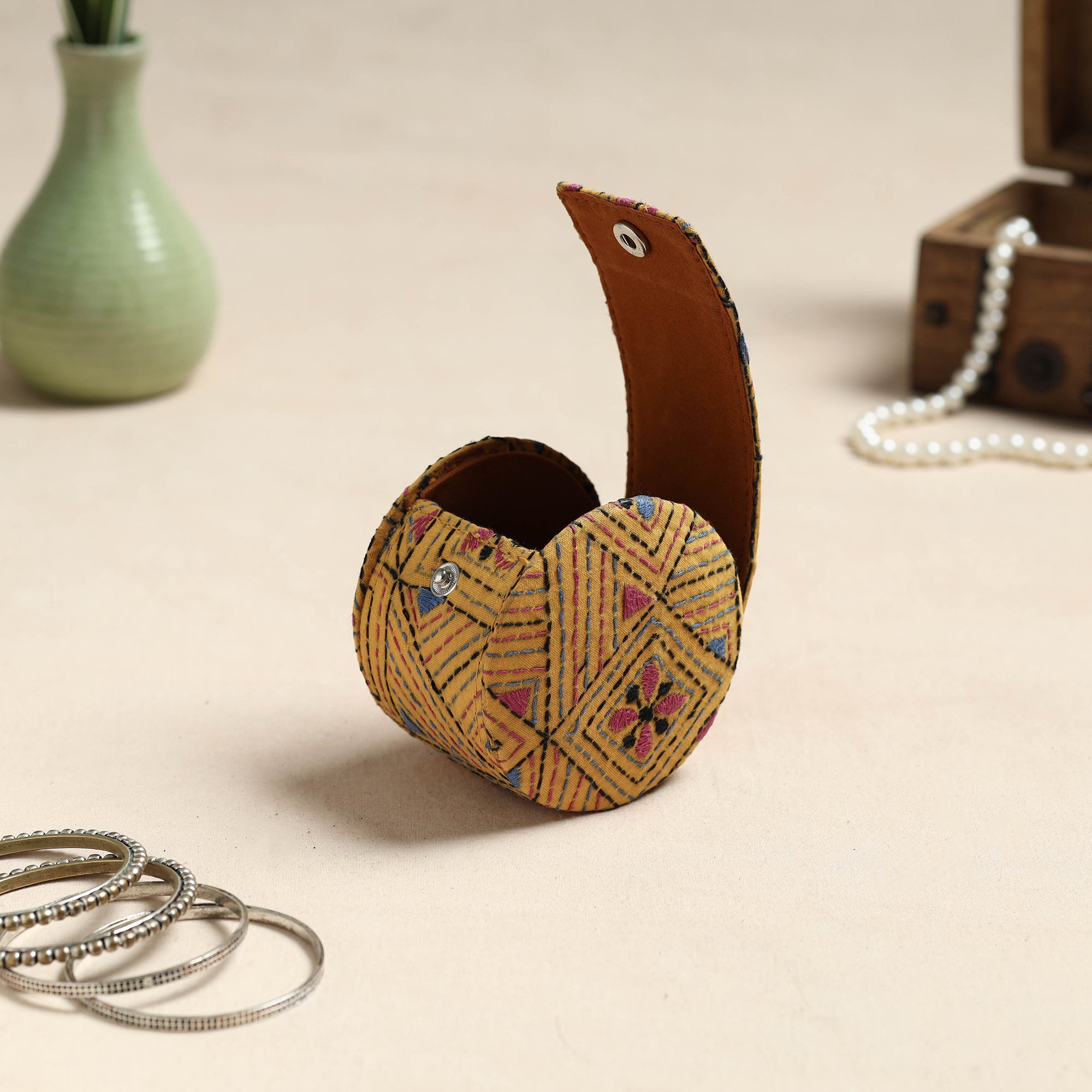 Elevate your jewelry collection with this exquisite handcrafted yellow bangle box from West Bengal, adorned with intricate Kantha work. Crafted from durable hardboard and lined with Kantha work fabric on the outside, this box features a soft velvet interior to protect and preserve your bangles and jewelry. Ideal for safekeeping and showcasing your precious accessories.