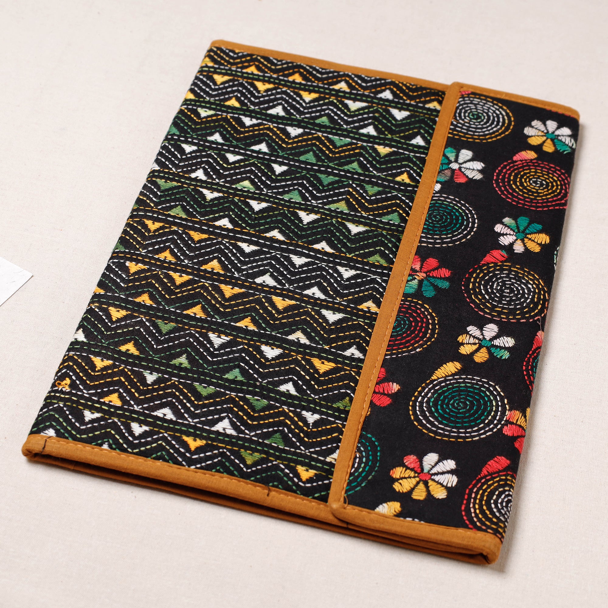 Fine quality black bengal kantha work handcrafted file folder from West Bengal. Made from mount board, the file folder is intricately designed with tiny running stitches in coloured thread using traditional craft technique. It has clip lock for papers & four pockets inside, use it for carrying papers and documents.