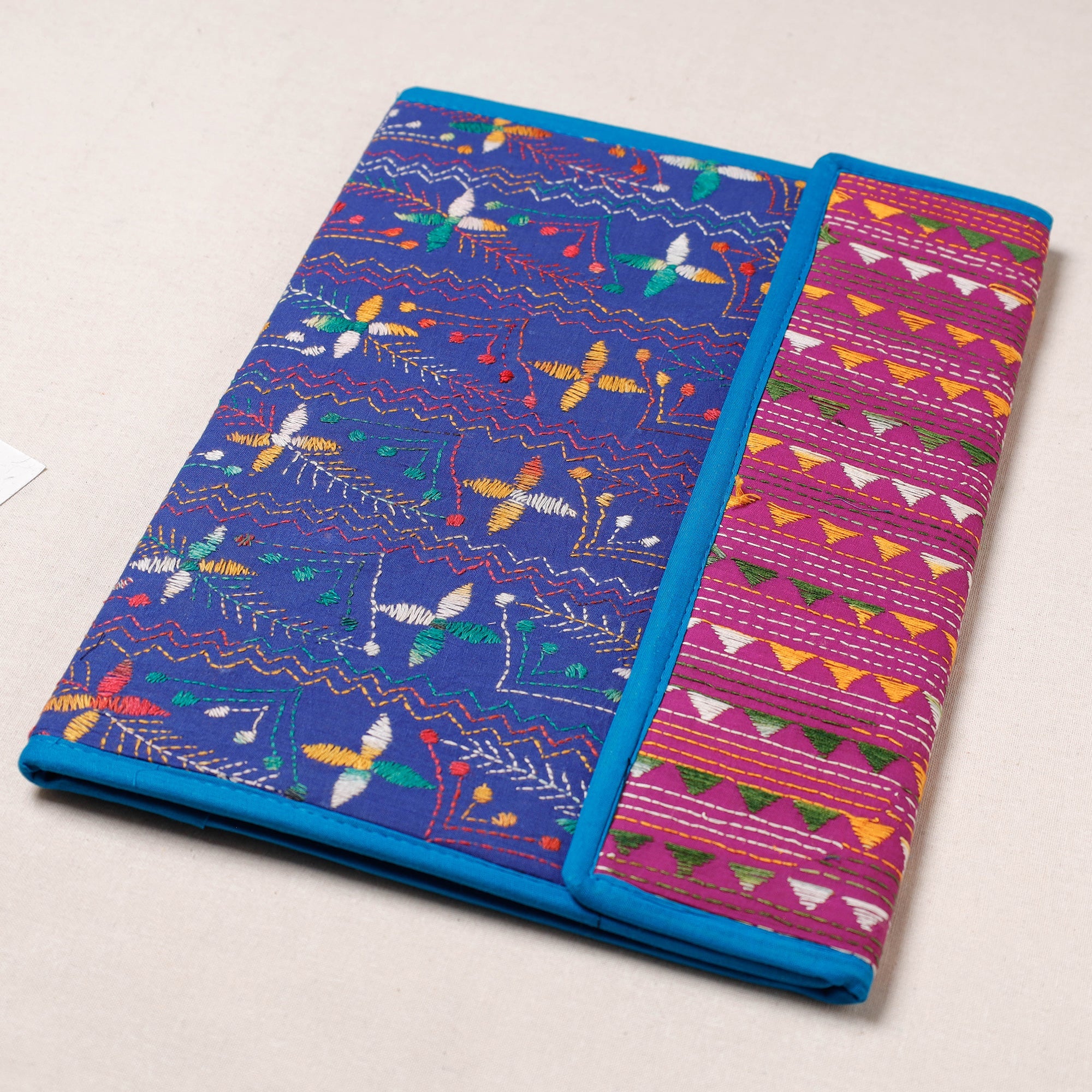 Fine quality blue bengal kantha work handcrafted file folder from West Bengal. Made from mount board, the file folder is intricately designed with tiny running stitches in coloured thread using traditional craft technique. It has clip lock for papers & four pockets inside, use it for carrying papers and documents.