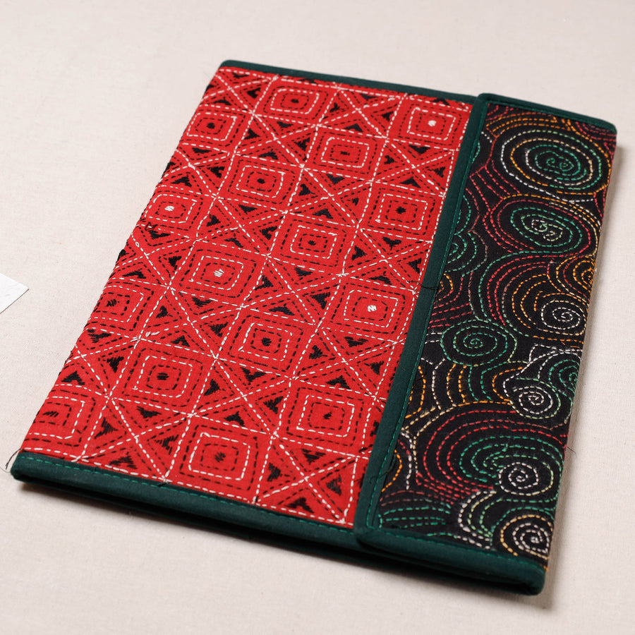 Fine quality red bengal kantha work handcrafted file folder from West Bengal. Made from mount board, the file folder is intricately designed with tiny running stitches in coloured thread using traditional craft technique. It has clip lock for papers & four pockets inside, use it for carrying papers and documents.