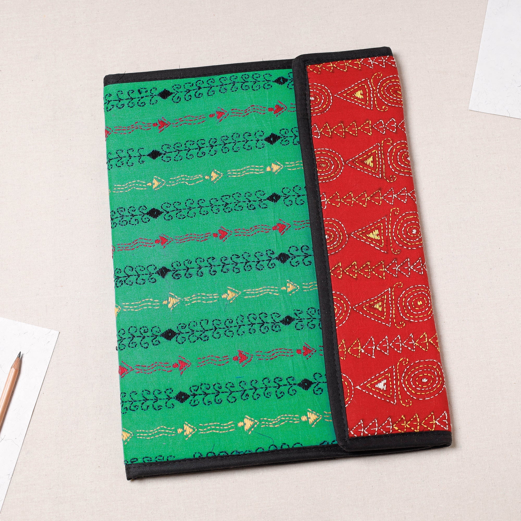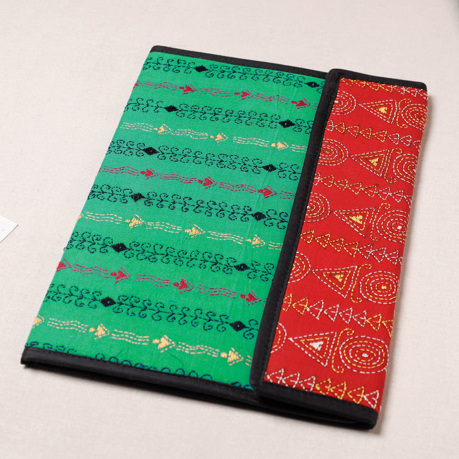 Fine quality green bengal kantha work handcrafted file folder from West Bengal. Made from mount board, the file folder is intricately designed with tiny running stitches in coloured thread using traditional craft technique. It has clip lock for papers & four pockets inside, use it for carrying papers and documents.