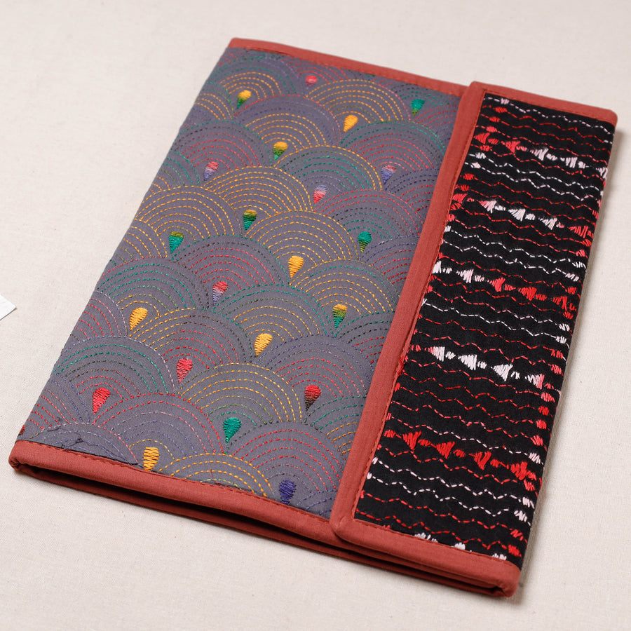 Fine quality grey bengal kantha work handcrafted file folder from West Bengal. Made from mount board, the file folder is intricately designed with tiny running stitches in coloured thread using traditional craft technique. It has clip lock for papers & four pockets inside, use it for carrying papers and documents.