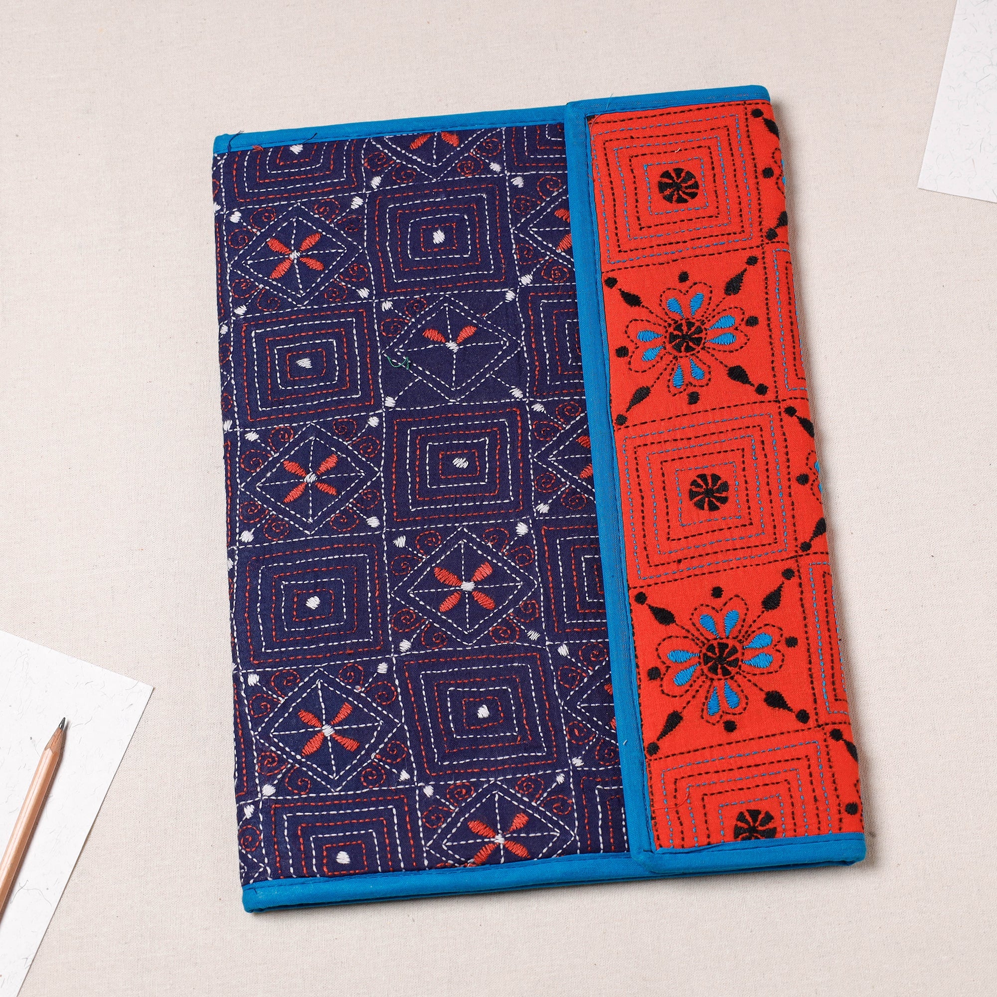 Fine quality blue bengal kantha work handcrafted file folder from West Bengal. Made from mount board, the file folder is intricately designed with tiny running stitches in coloured thread using traditional craft technique. It has clip lock for papers & four pockets inside, use it for carrying papers and documents.
