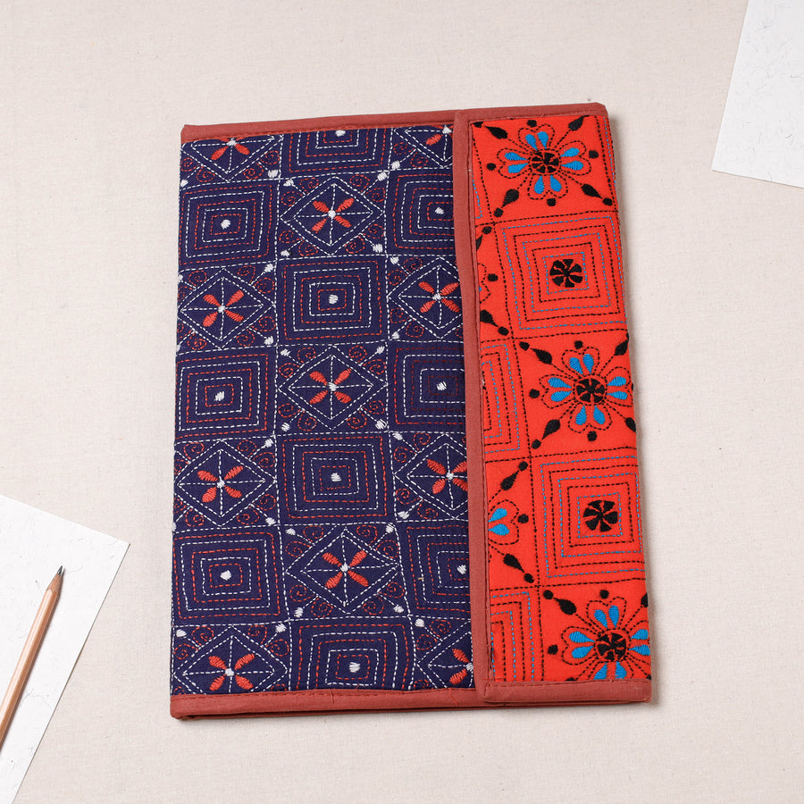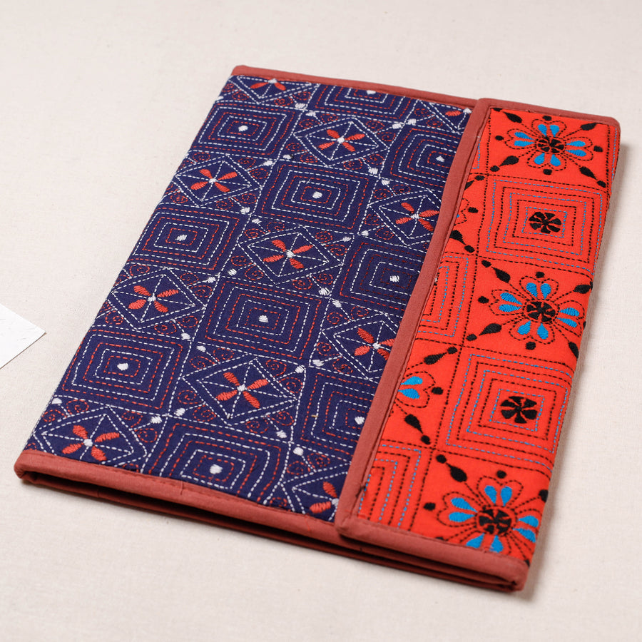 Fine quality blue bengal kantha work handcrafted file folder from West Bengal. Made from mount board, the file folder is intricately designed with tiny running stitches in coloured thread using traditional craft technique. It has clip lock for papers & four pockets inside, use it for carrying papers and documents.