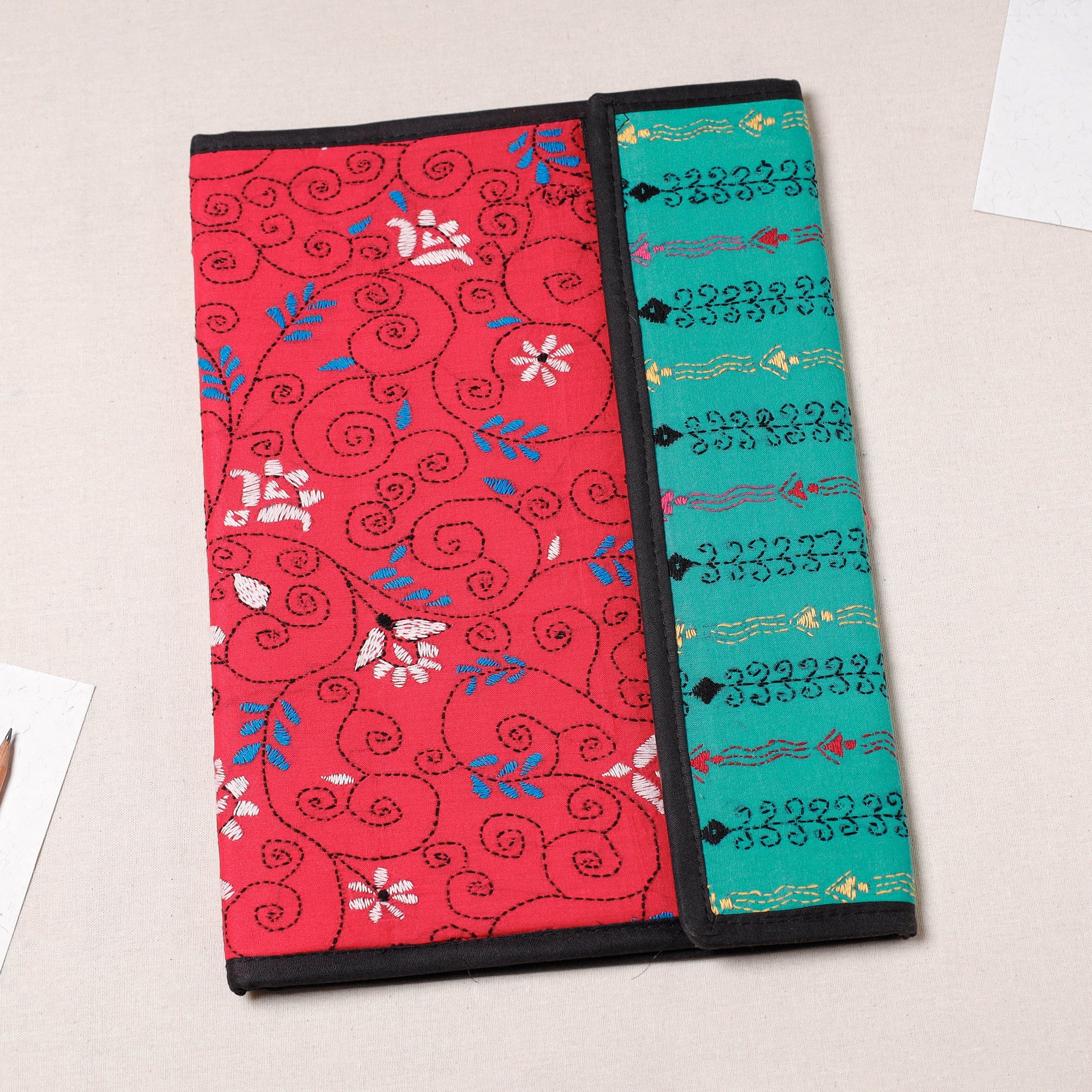 Fine quality red bengal kantha work handcrafted file folder from West Bengal. Made from mount board, the file folder is intricately designed with tiny running stitches in coloured thread using traditional craft technique. It has clip lock for papers & four pockets inside, use it for carrying papers and documents.