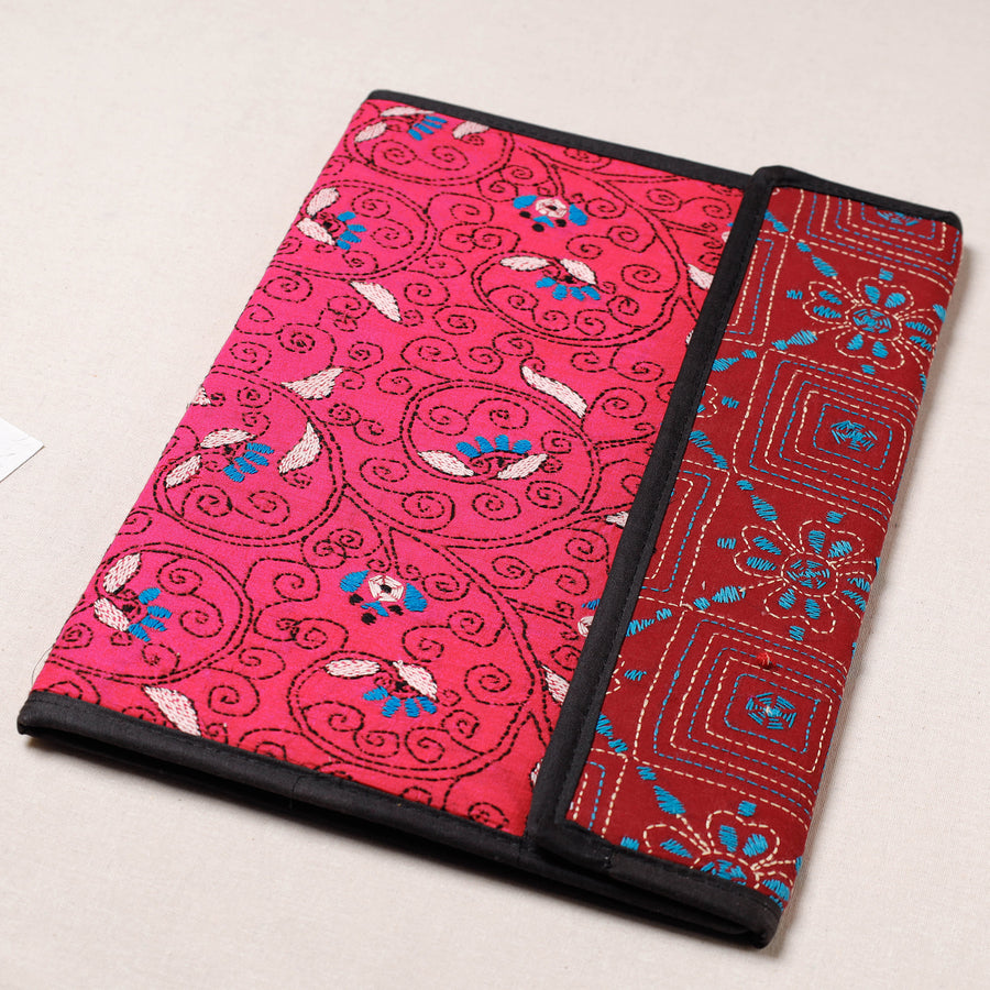 Fine quality pink bengal kantha work handcrafted file folder from West Bengal. Made from mount board, the file folder is intricately designed with tiny running stitches in coloured thread using traditional craft technique. It has clip lock for papers & four pockets inside, use it for carrying papers and documents.