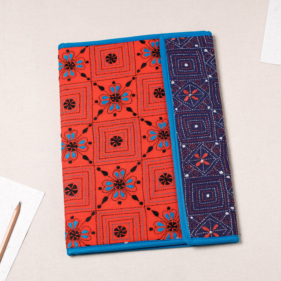 Fine quality red bengal kantha work handcrafted file folder from West Bengal. Made from mount board, the file folder is intricately designed with tiny running stitches in coloured thread using traditional craft technique. It has clip lock for papers & four pockets inside, use it for carrying papers and documents.