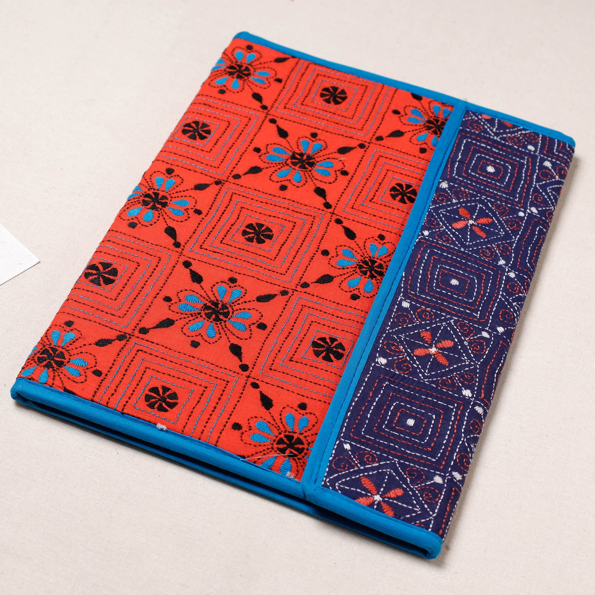 Fine quality red bengal kantha work handcrafted file folder from West Bengal. Made from mount board, the file folder is intricately designed with tiny running stitches in coloured thread using traditional craft technique. It has clip lock for papers four pockets inside, use it for carrying papers and documents.