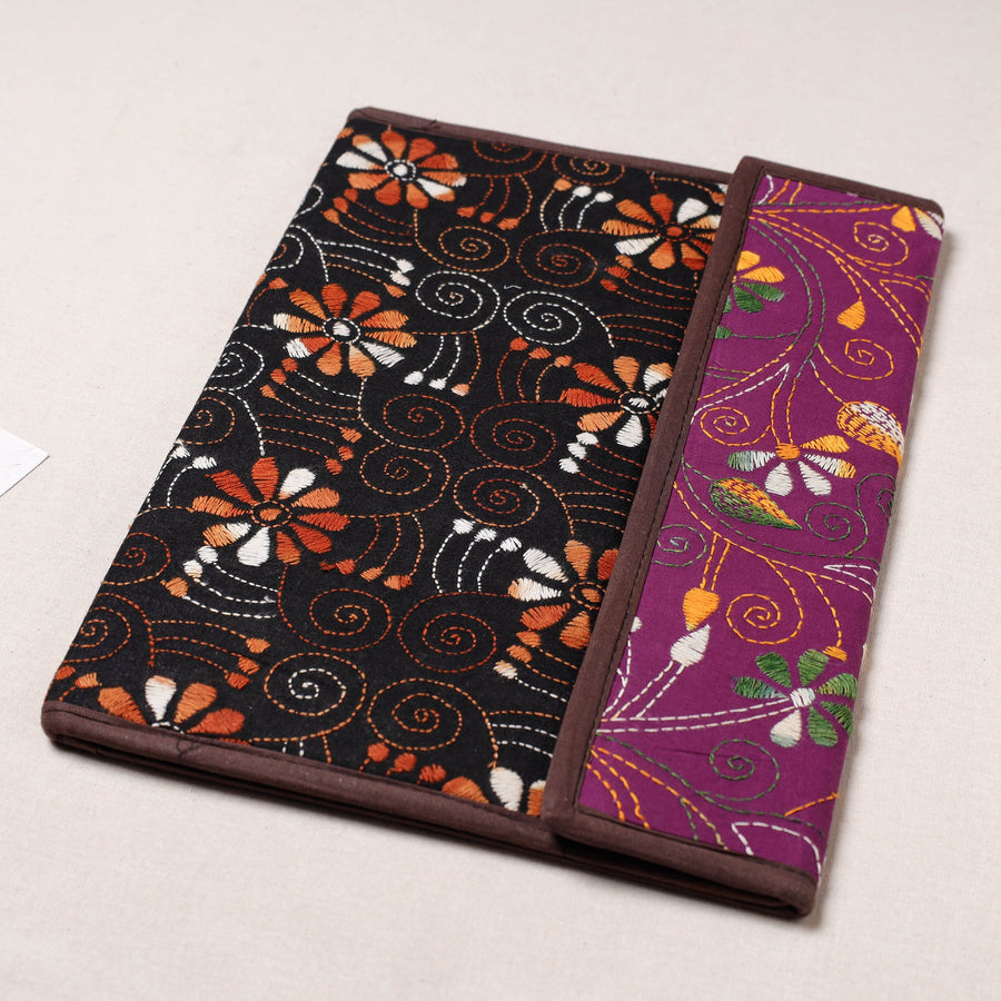 Fine quality black bengal kantha work handcrafted file folder from West Bengal. Made from mount board, the file folder is intricately designed with tiny running stitches in coloured thread using traditional craft technique. It has clip lock for papers & four pockets inside, use it for carrying papers and documents.