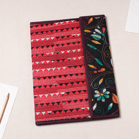 Fine quality red bengal kantha work handcrafted file folder from West Bengal. Made from mount board, the file folder is intricately designed with tiny running stitches in coloured thread using traditional craft technique. It has clip lock for papers & four pockets inside, use it for carrying papers and documents.
