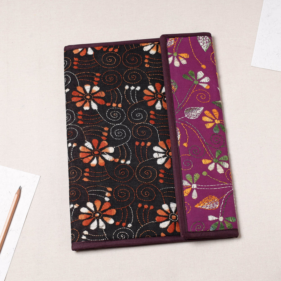Fine quality black bengal kantha work handcrafted file folder from West Bengal. Made from mount board, the file folder is intricately designed with tiny running stitches in coloured thread using traditional craft technique. It has clip lock for papers & four pockets inside, use it for carrying papers and documents.