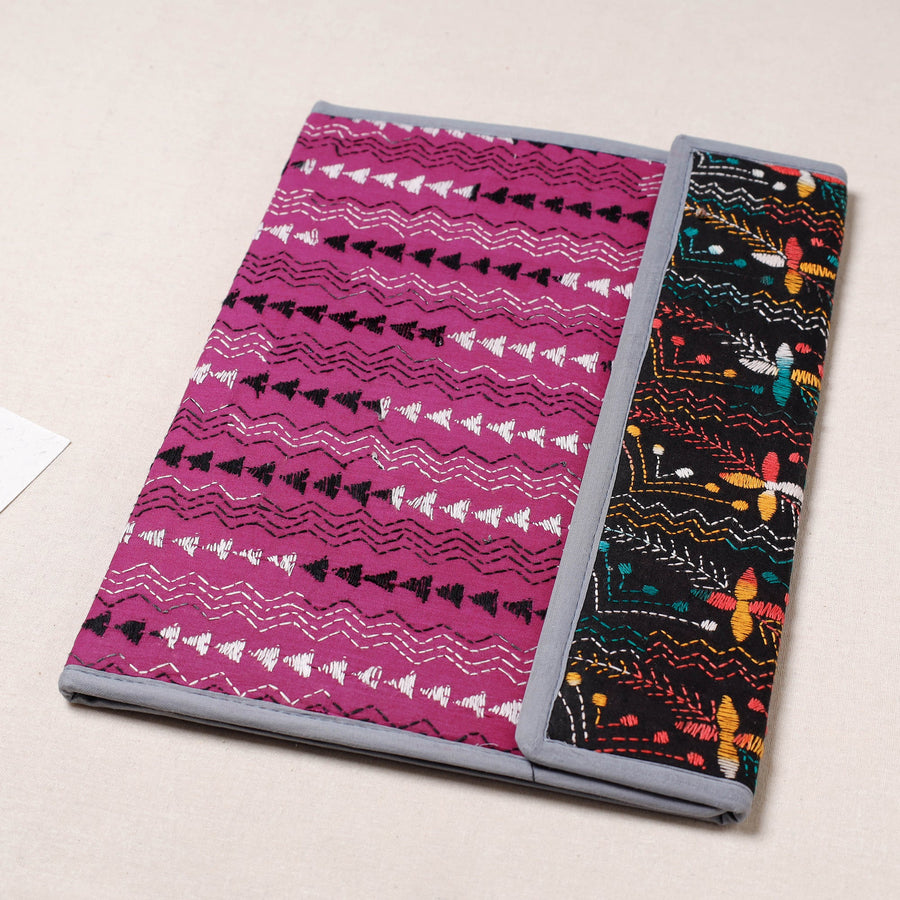 | Material | Fine quality pink bengal kantha work handcrafted file folder from West Bengal. Made from mount board, the file folder is intricately designed with tiny running stitches in coloured thread using traditional craft technique. It has clip lock for papers & four pockets inside, use it for carrying papers and documents. |