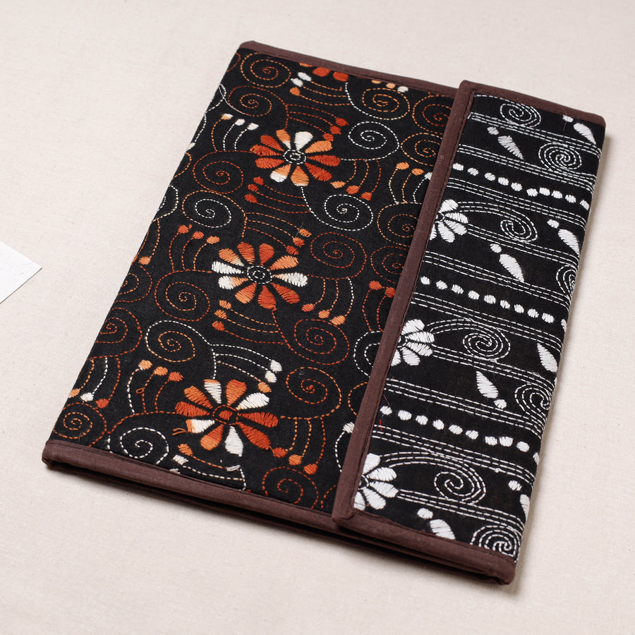 Fine quality black bengal kantha work handcrafted file folder from West Bengal. Made from mount board, the file folder is intricately designed with tiny running stitches in coloured thread using traditional craft technique. It has clip lock for papers & four pockets inside, use it for carrying papers and documents.