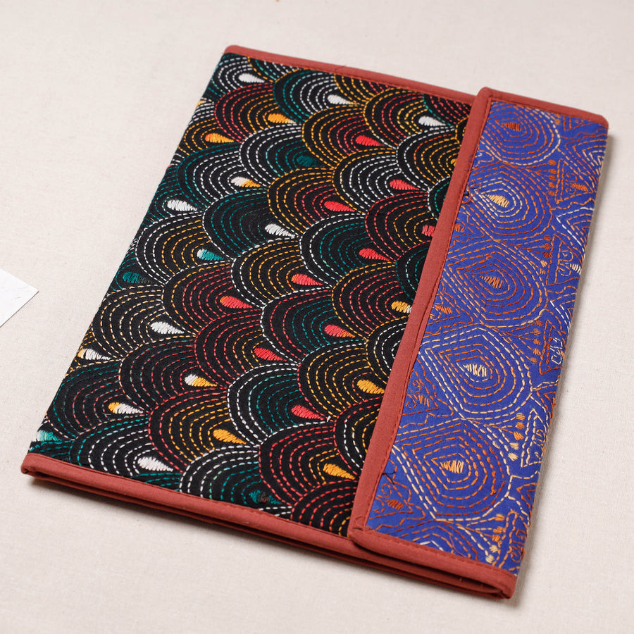 Fine quality multicolor bengal kantha work handcrafted file folder from West Bengal. Made from mount board, the file folder is intricately designed with tiny running stitches in coloured thread using traditional craft technique. It has clip lock for papers & four pockets inside, use it for carrying papers and documents.