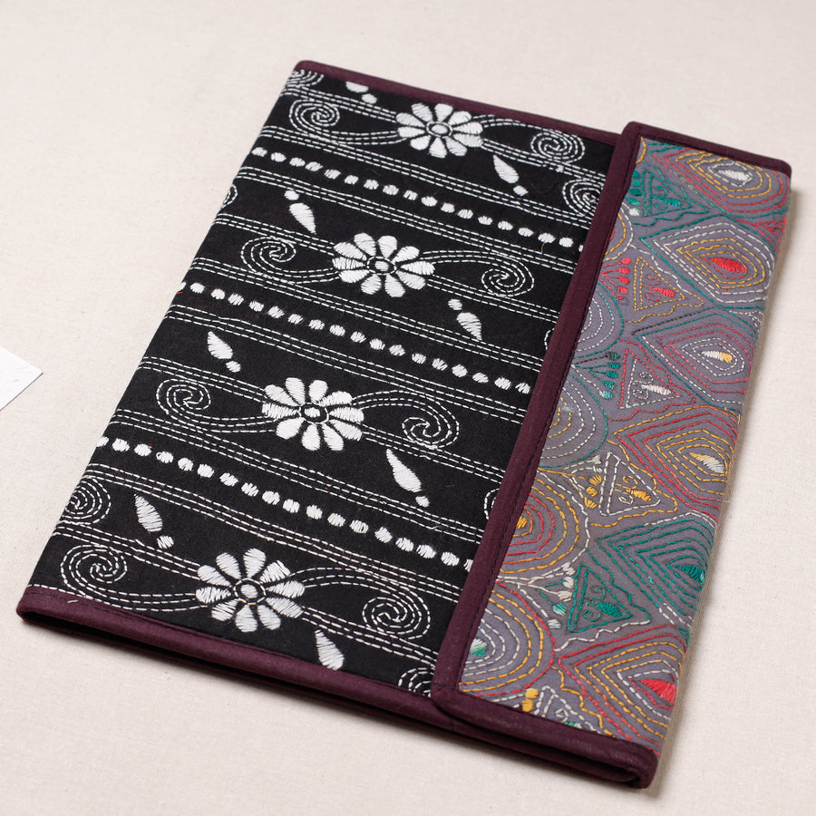 Fine quality black bengal kantha work handcrafted file folder from West Bengal. Made from mount board, the file folder is intricately designed with tiny running stitches in coloured thread using traditional craft technique. It has clip lock for papers & four pockets inside, use it for carrying papers and documents.