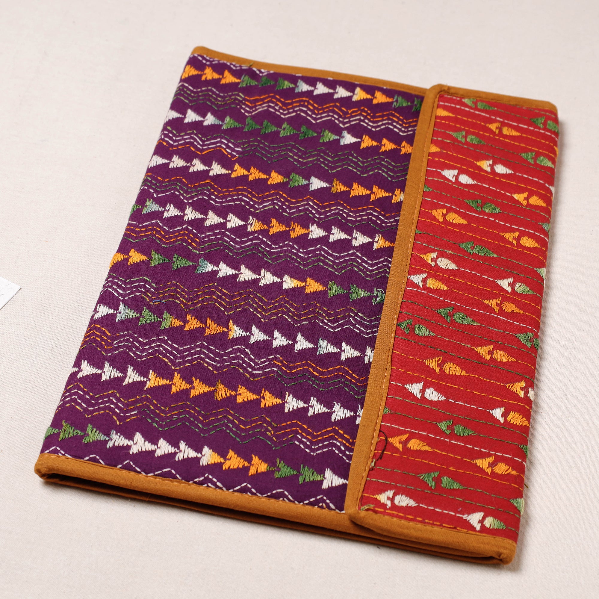 Fine quality purple bengal kantha work handcrafted file folder from West Bengal. Made from mount board, the file folder is intricately designed with tiny running stitches in coloured thread using traditional craft technique. It has clip lock for papers & four pockets inside, use it for carrying papers and documents.