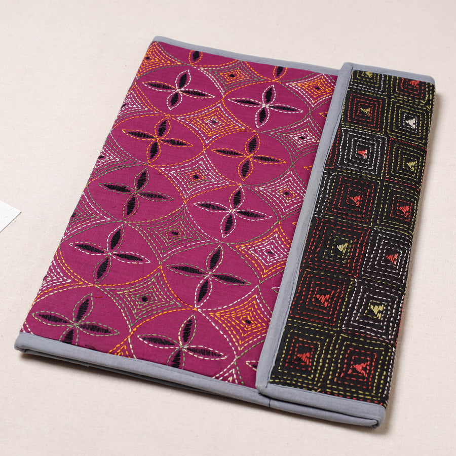 Fine quality pink bengal kantha work handcrafted file folder from West Bengal. Made from mount board, the file folder is intricately designed with tiny running stitches in coloured thread using traditional craft technique. It has clip lock for papers & four pockets inside, use it for carrying papers and documents.