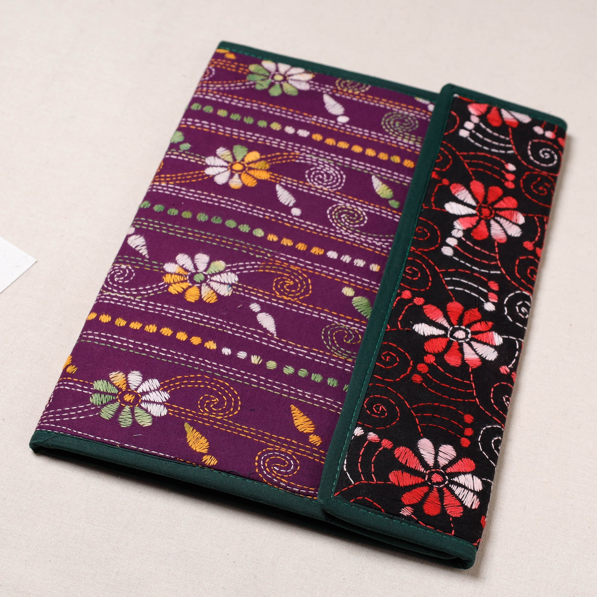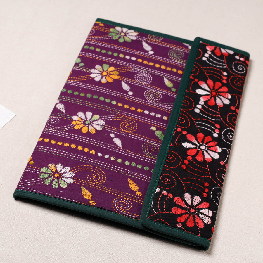 Fine quality purple bengal kantha work handcrafted file folder from West Bengal. Made from mount board, the file folder is intricately designed with tiny running stitches in coloured thread using traditional craft technique. It has clip lock for papers & four pockets inside, use it for carrying papers and documents.
