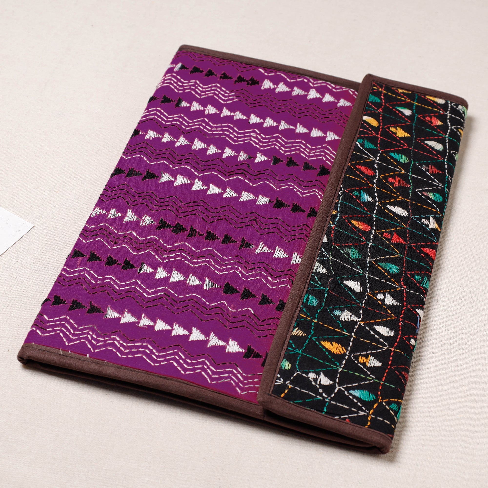 | Material | Fine quality purple bengal kantha work handcrafted file folder from West Bengal. Made from mount board, the file folder is intricately designed with tiny running stitches in coloured thread using traditional craft technique. It has clip lock for papers & four pockets inside, use it for carrying papers and documents. |