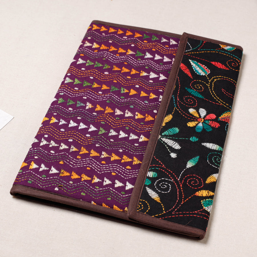 Fine quality purple bengal kantha work handcrafted file folder from West Bengal. Made from mount board, the file folder is intricately designed with tiny running stitches in coloured thread using traditional craft technique. It has clip lock for papers & four pockets inside, use it for carrying papers and documents.