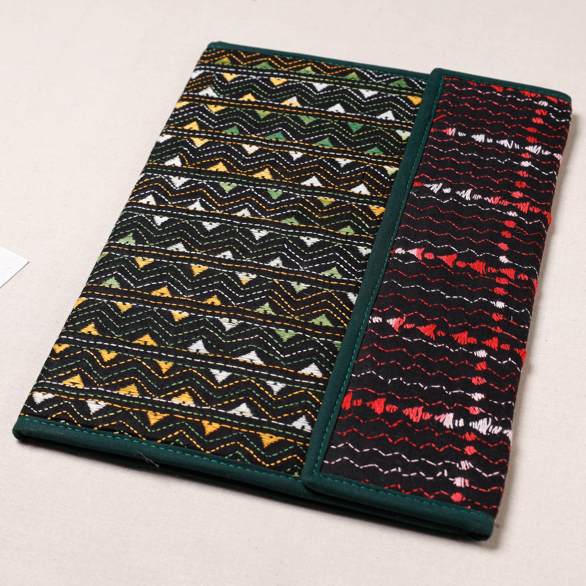 Fine quality black bengal kantha work handcrafted file folder from West Bengal. Made from mount board, the file folder is intricately designed with tiny running stitches in coloured thread using traditional craft technique. It has clip lock for papers & four pockets inside, use it for carrying papers and documents.