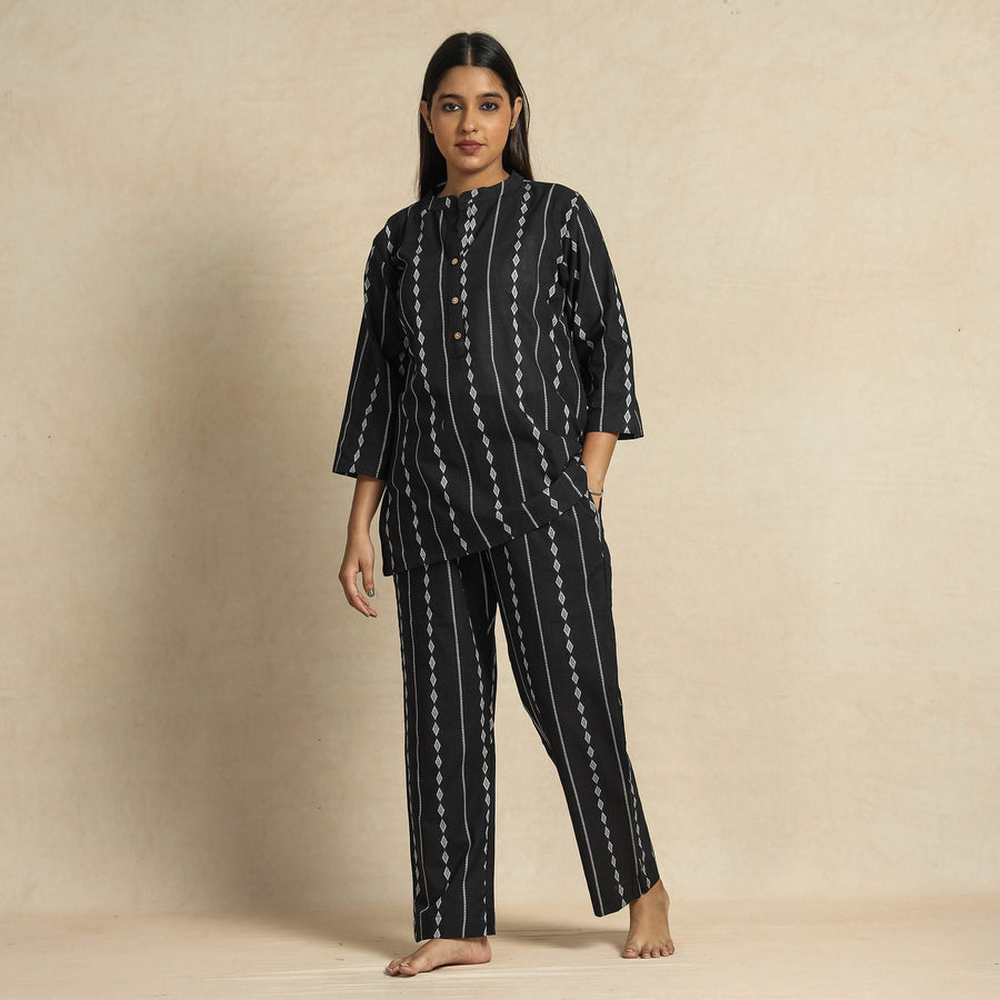 This jacquard top and pyjama night suit set is crafted from jacquard weave cotton fabric. The cotton fabric ensures a comfortable night's sleep. The pyjama features an elasticated waist and two side pockets for added convenience. The night suit will give you the freedom to customsize the fit to suit your unique shape. This night suit is beautiful and skin-friendly, and it allows you to move and sleep with ease and comfort.