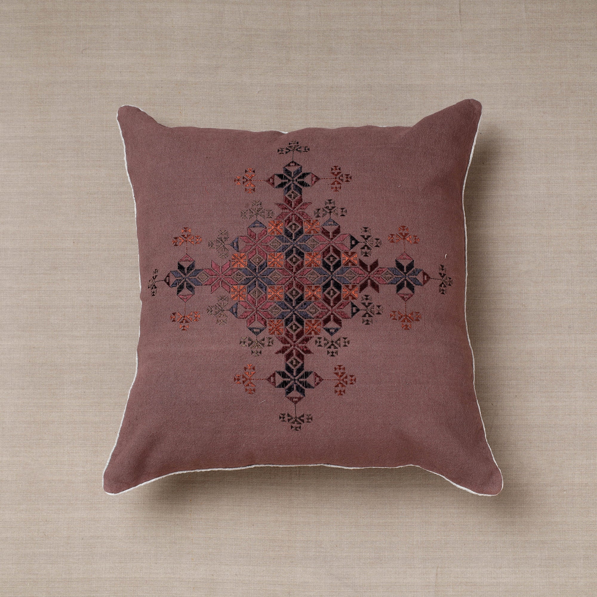 Elavate your home decor with this purple soof embroidery cotton cushion cover. Crafted from high-quality cotton, it features intricate embroidery, adding elegance to any room. This versatile cushion cover not only protects your cushions but also transforms your living space, making it cozier and more stylish. Soof embroidery is a traditional Indian art form known for its delicate, geometric patterns worked with chain stitches, often on clothing and textiles.