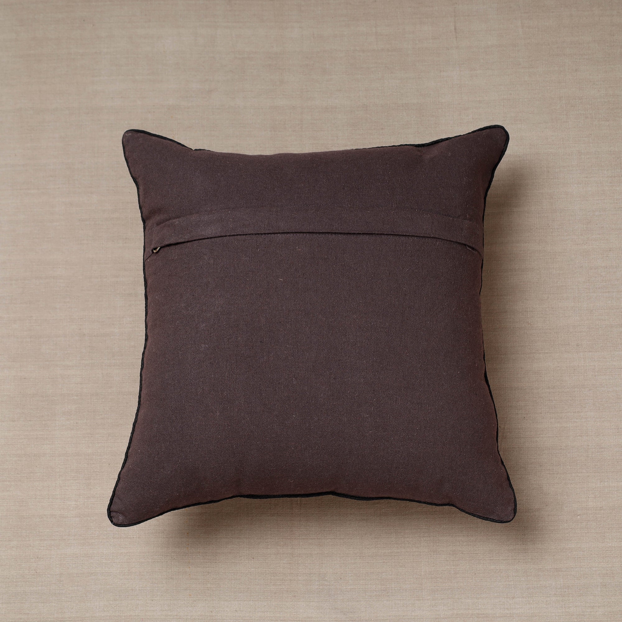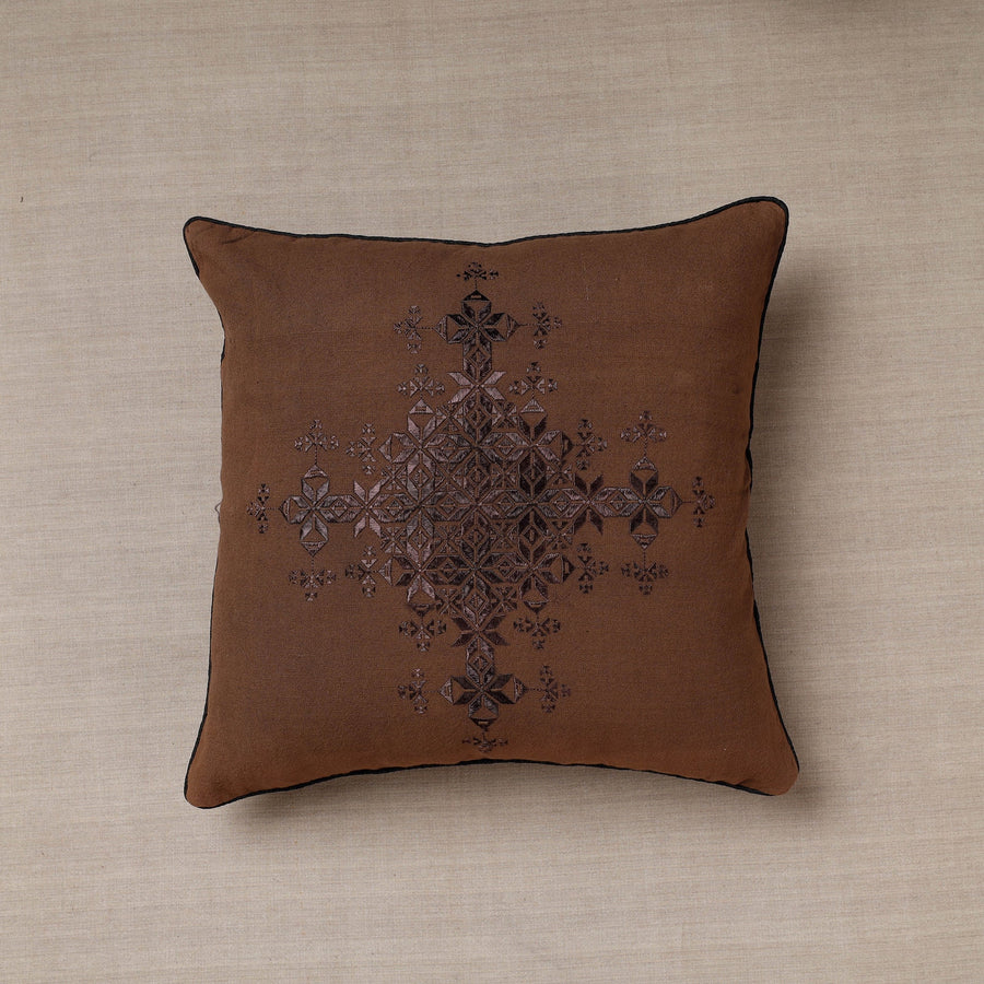 Elavate your home decor with this brown soof embroidery cotton cushion cover. Crafted from high-quality cotton, it features intricate embroidery, adding elegance to any room. This versatile cushion cover not only protects your cushions but also transforms your living space, making it cozier and more stylish. Soof embroidery is a traditional Indian art form known for its delicate, geometric patterns worked with chain stitches, often on clothing and textiles.