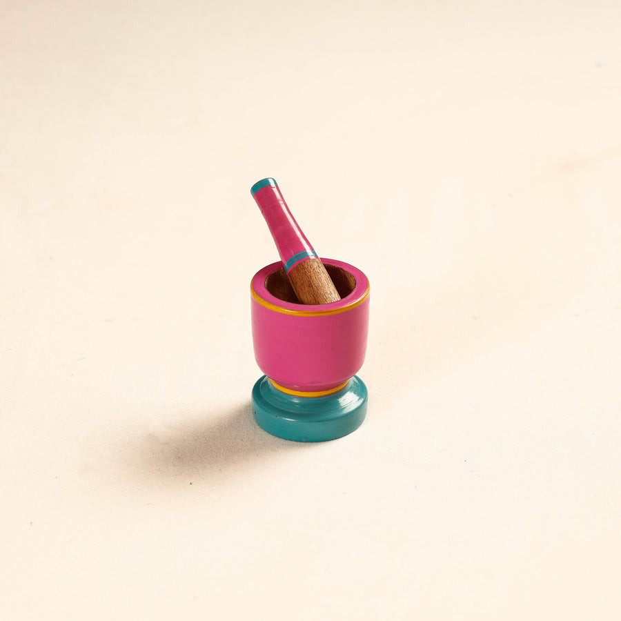 This handcrafted wooden mortar and pestle set is made of babool wood with lacquered colours. This set meticulously handcrafted by skilled artisans from the Vadha community in villages like Nirona and Jura. They begin by selecting babool wood, which is known for its durability and strength. Layers of coloured lacquer are applied to the wood, and intricate designs and effects are chiselled to create a stunning visual appeal.