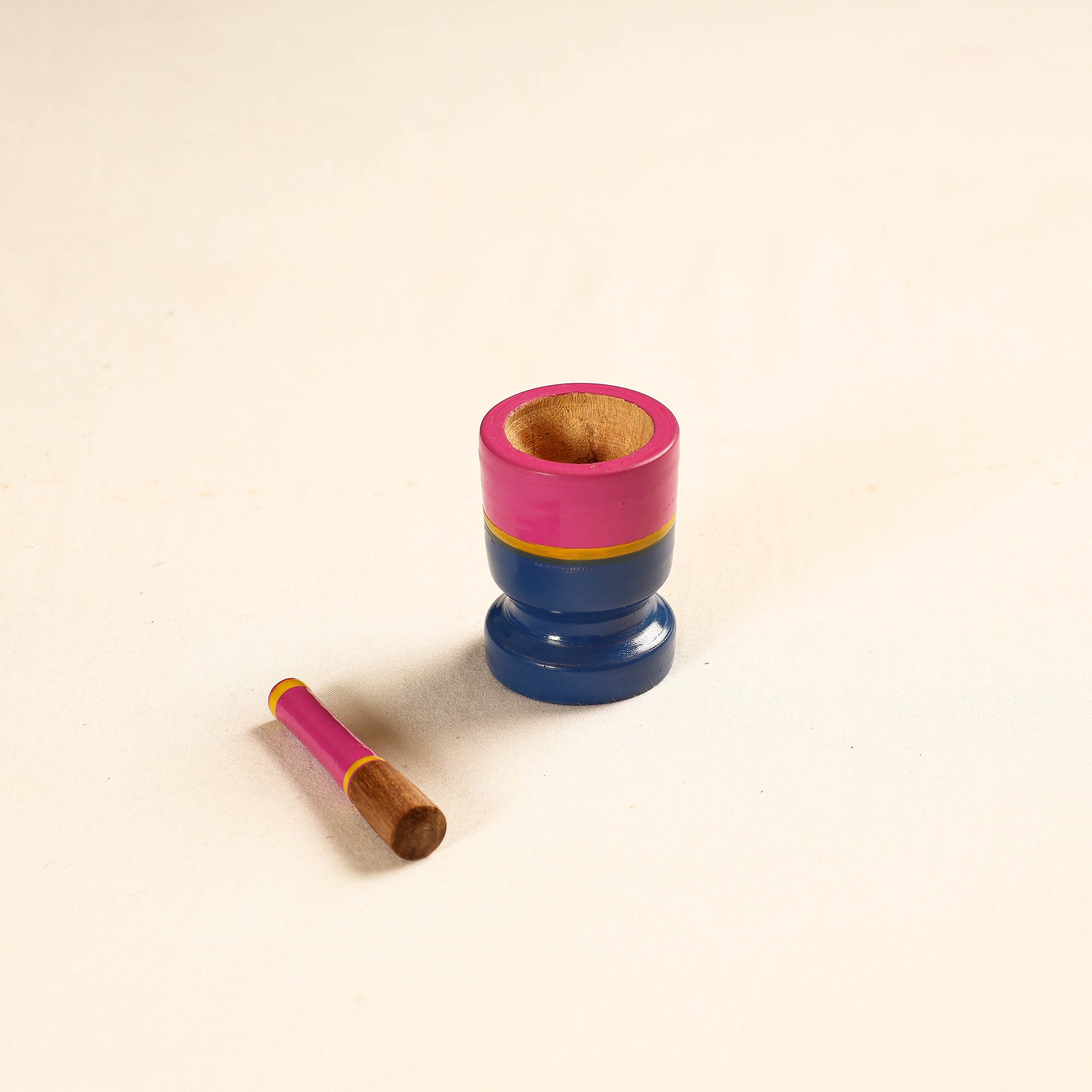 This handcrafted wooden mortar and pestle set is made of babool wood with lacquered colours. This set meticulously handcrafted by skilled artisans from the Vadha community in villages like Nirona and Jura. They begin by selecting babool wood, which is known for its durability and strength. Layers of coloured lacquer are applied to the wood, and intricate designs and effects are chiselled to create a stunning visual appeal.