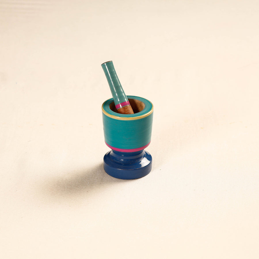 This handcrafted wooden mortar and pestle set is made of babool wood with lacquered colours. This set meticulously handcrafted by skilled artisans from the Vadha community in villages like Nirona and Jura. They begin by selecting babool wood, which is known for its durability and strength. Layers of coloured lacquer are applied to the wood, and intricate designs and effects are chiselled to create a stunning visual appeal.