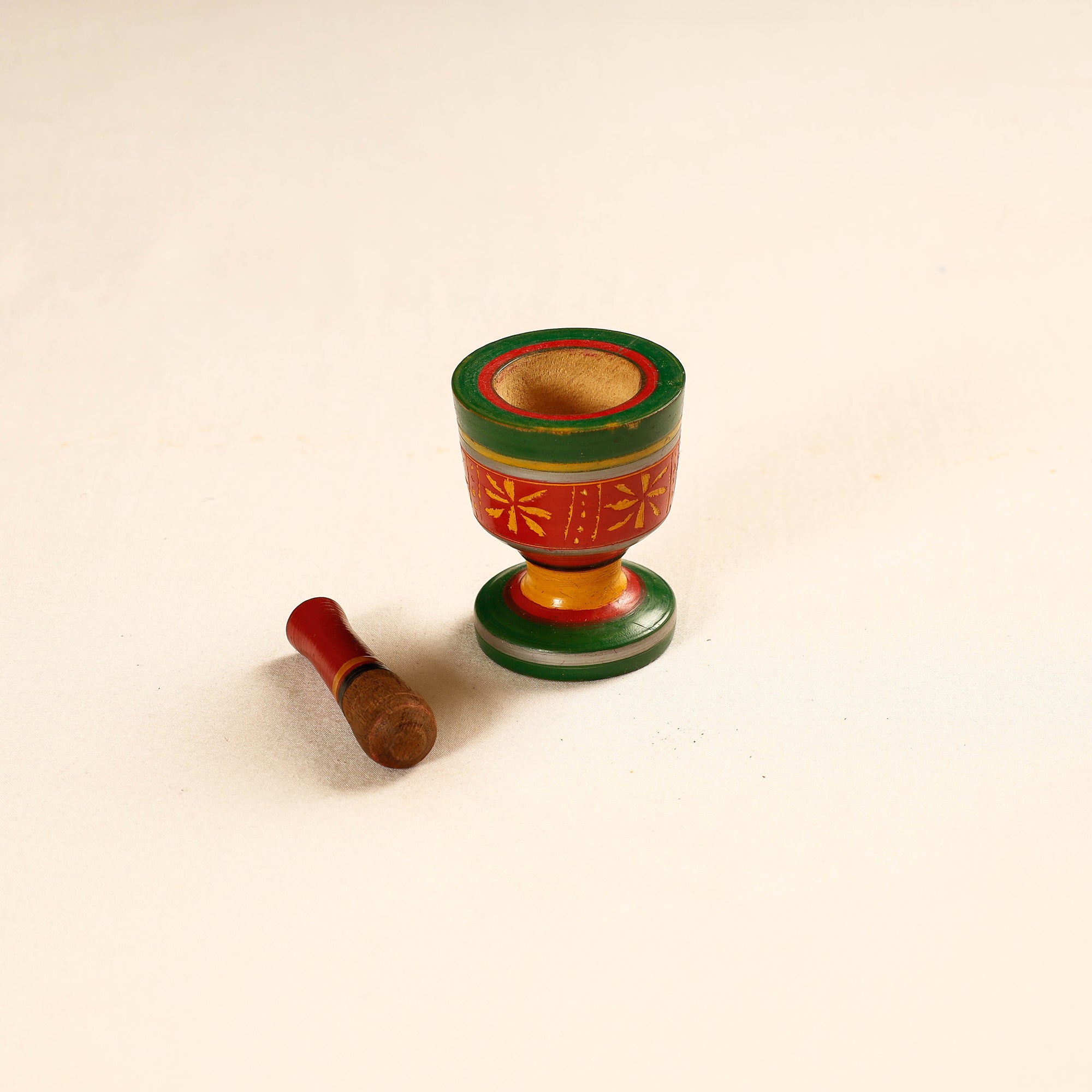 This handcrafted wooden mortar and pestle set is made of babool wood with lacquered colours. This set meticulously handcrafted by skilled artisans from the Vadha community in villages like Nirona and Jura. They begin by selecting babool wood, which is known for its durability and strength. Layers of coloured lacquer are applied to the wood, and intricate designs and effects are chiselled to create a stunning visual appeal.