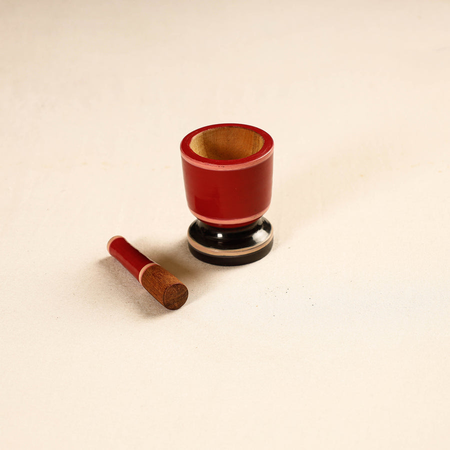 This handcrafted wooden mortar and pestle set is made of babool wood with lacquered colours. This set meticulously handcrafted by skilled artisans from the Vadha community in villages like Nirona and Jura. They begin by selecting babool wood, which is known for its durability and strength. Layers of coloured lacquer are applied to the wood, and intricate designs and effects are chiselled to create a stunning visual appeal.