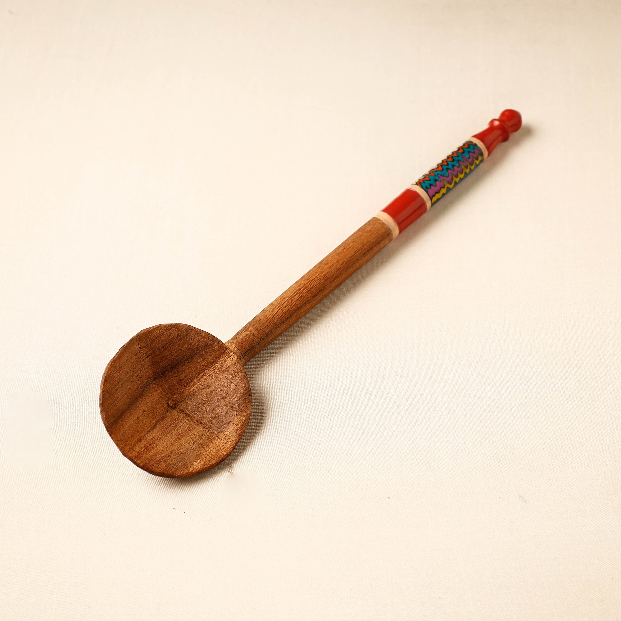 This exquisitely handcrafted ladle spoon made of babool wood with lacquered colours. This ladle spoon is meticulously handcrafted by skilled artisans from the Vadha community in villages like Nirona and Jura. They begin by selecting babool wood, which is known for its durability and strength. Layers of coloured lacquer are applied to the wood, and intricate designs and effects are chiselled to create a stunning visual appeal.