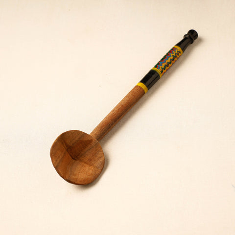 This exquisitely handcrafted ladle spoon made of babool wood with lacquered colours. This ladle spoon is meticulously handcrafted by skilled artisans from the Vadha community in villages like Nirona and Jura. They begin by selecting babool wood, which is known for its durability and strength. Layers of coloured lacquer are applied to the wood, and intricate designs and effects are chiselled to create a stunning visual appeal.