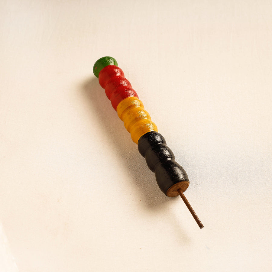 This handcrafted wooden wall hanger is made of babool wood with lacquered colours. This wall hanger meticulously handcrafted by skilled artisans from the Vadha community in villages like Nirona and Jura. They begin by selecting babool wood, which is known for its durability and strength. Layers of coloured lacquer are applied to the wood, and intricate designs and effects are chiselled to create a stunning visual appeal.