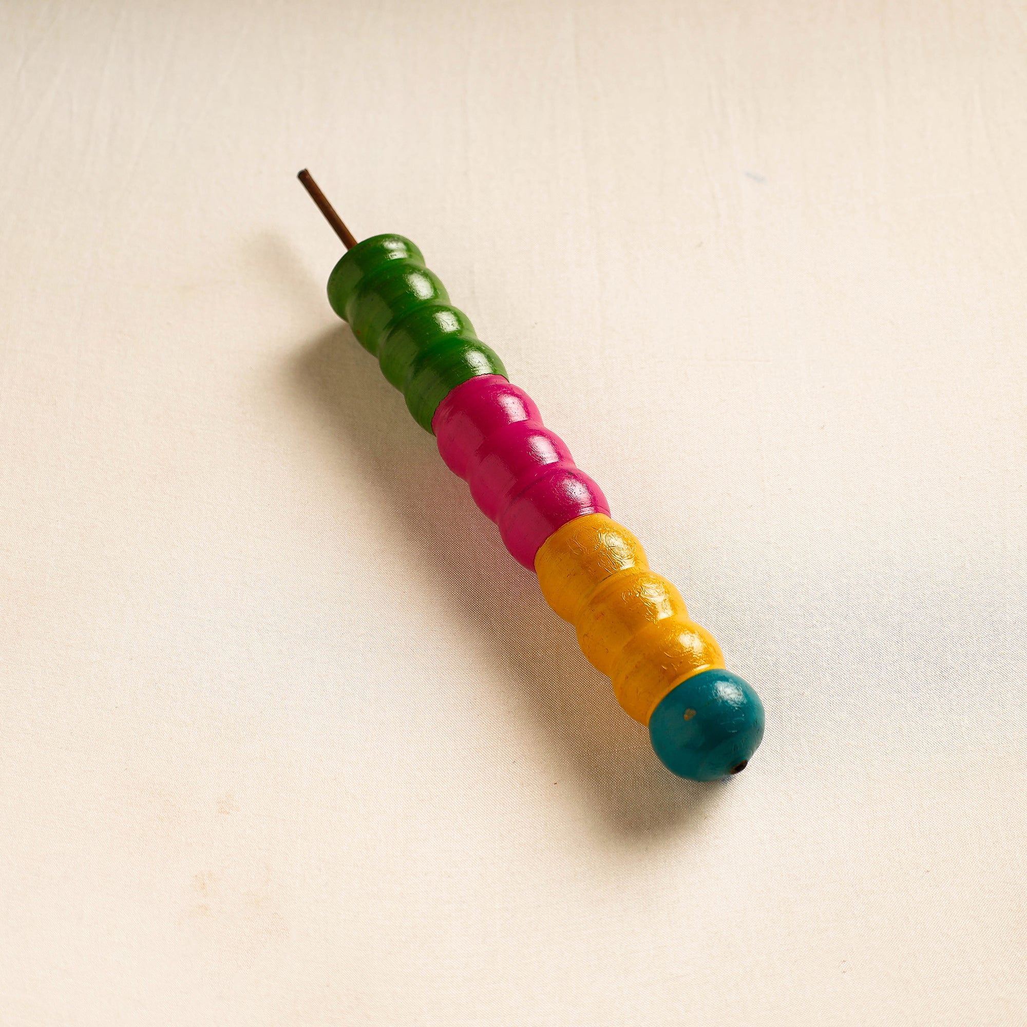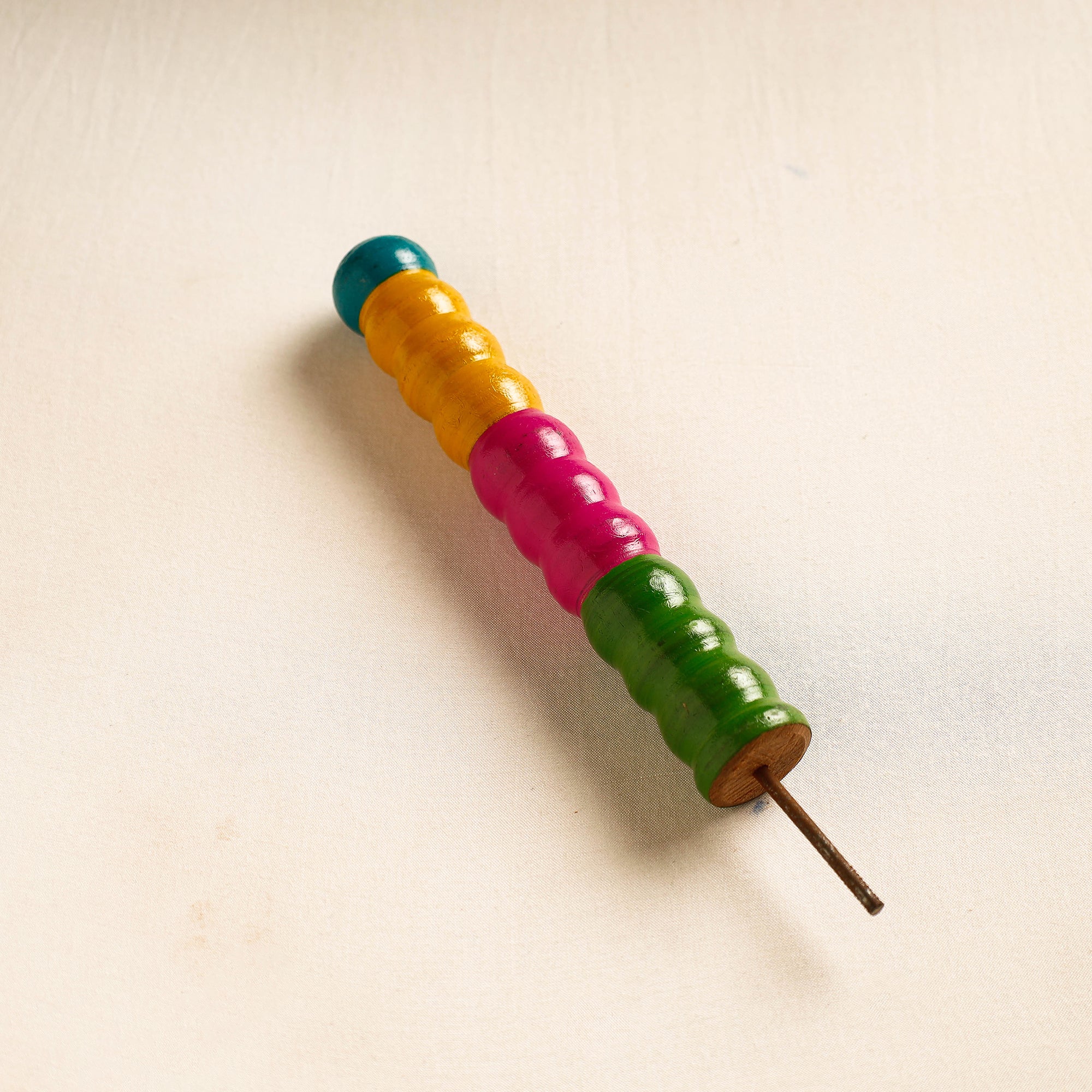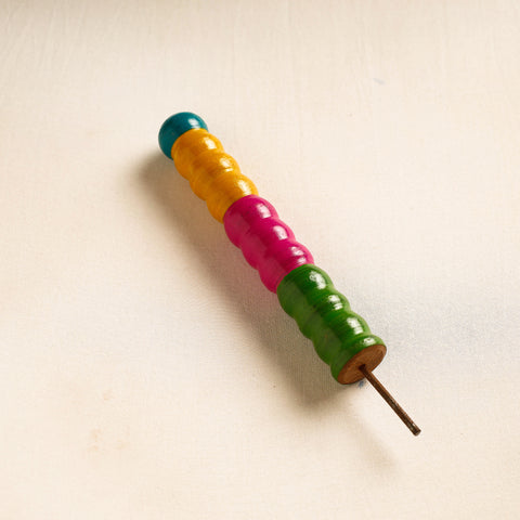 This handcrafted wooden wall hanger is made of babool wood with lacquered colours. This wall hanger meticulously handcrafted by skilled artisans from the Vadha community in villages like Nirona and Jura. They begin by selecting babool wood, which is known for its durability and strength. Layers of coloured lacquer are applied to the wood, and intricate designs and effects are chiselled to create a stunning visual appeal.