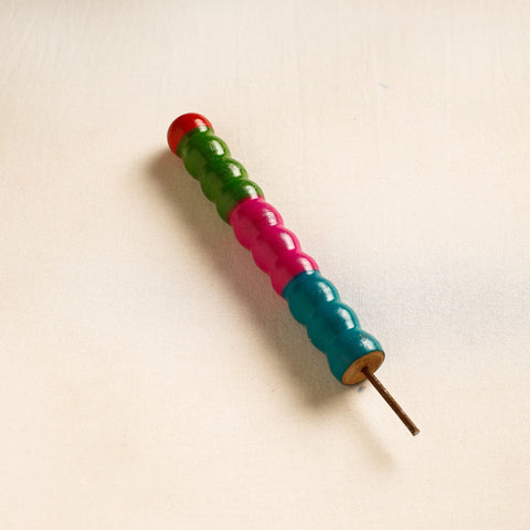 This handcrafted wooden wall hanger is made of babool wood with lacquered colours. This wall hanger meticulously handcrafted by skilled artisans from the Vadha community in villages like Nirona and Jura. They begin by selecting babool wood, which is known for its durability and strength. Layers of coloured lacquer are applied to the wood, and intricate designs and effects are chiselled to create a stunning visual appeal.